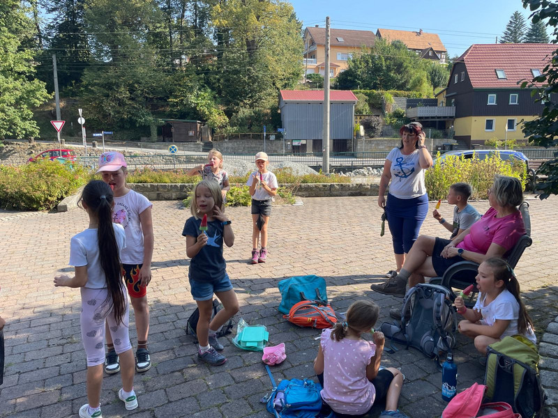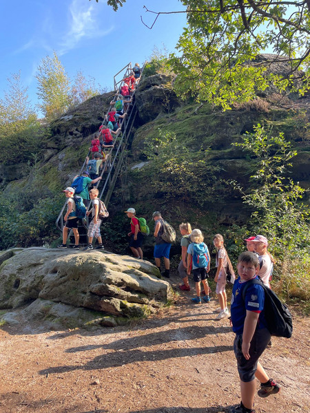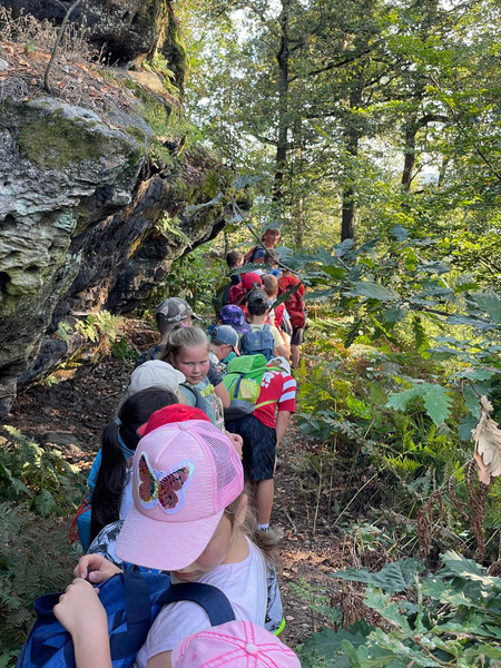 Bei herrlichstem Wanderwetter besuchte die Klasse 3 auch die Stele auf dem Schulhof der ehemaligen Schule in Krippen und alle bestiegen die Kaiserkrone, einen abgeschliffenen und zerklüfteten Rest eines Tafelberges mit einer Höhe von 351m ü NHN. Ein weiterer Höhepunkt war, dass die ehemalige Klassenlehrerin Frau Wurm den Wandertag mit begleitete.