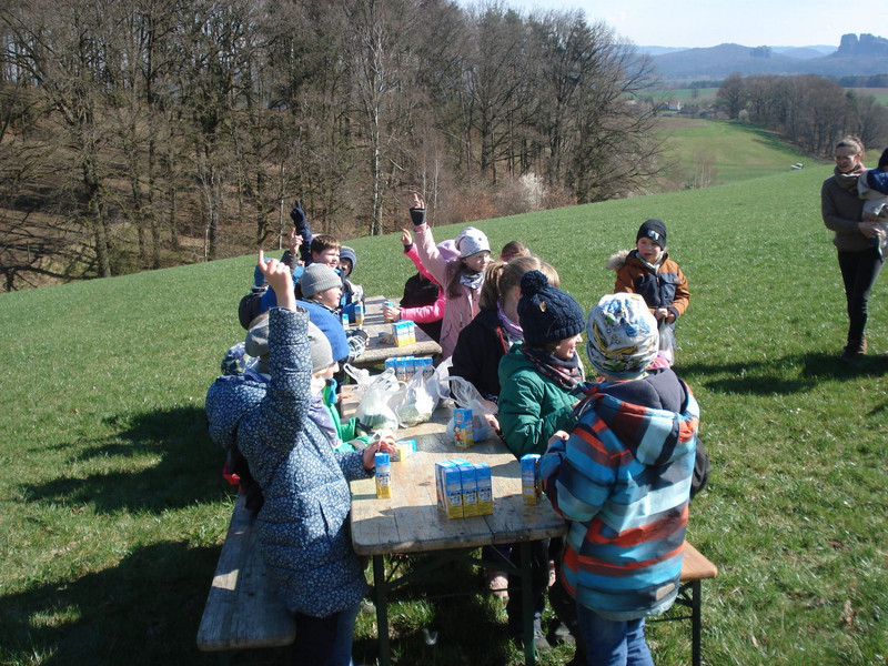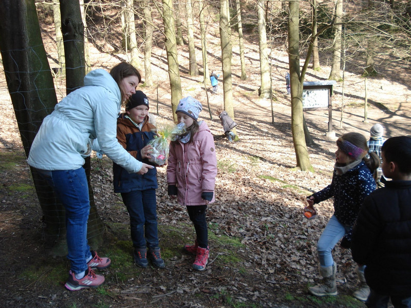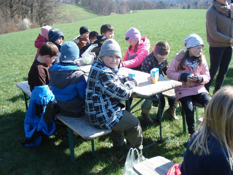 Bei herrlichem Sonnenschein machten sich die Schüler der Klasse 1 nach der Hofpause auf den Weg zum Wildgehege. Der Osterhase sollte dort gesichtet worden sein. Wir machten uns natürlich im Wald gleich auf die Suche und jeder fand ein Osternest. Dann wurde für uns noch gegrillt und es gab Wiener, Bratwurst und Steaks, die wir uns schmecken ließen. Ein herzliches Dankeschön an Frau Liepe, Frau Müller und Familie Wurm. Das war ein sehr schöner Tag und eine gelungene Überraschung.