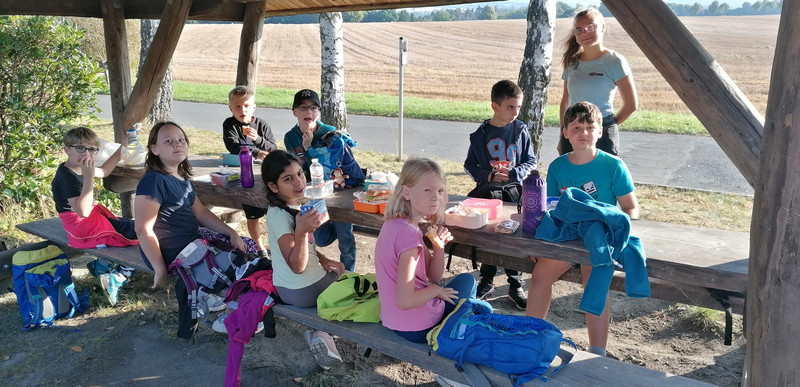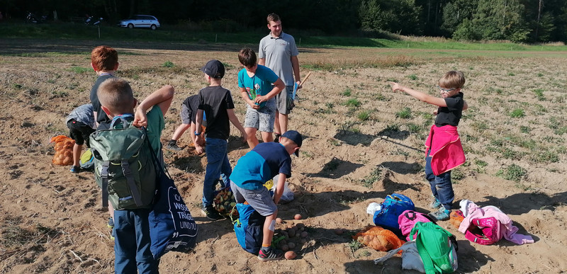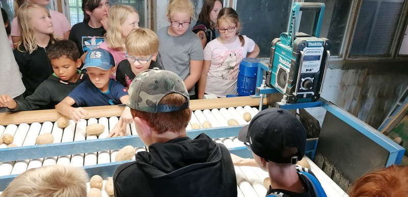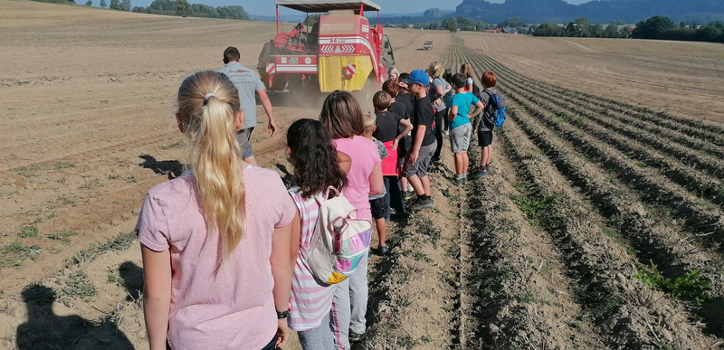 Am 21. September 2023 stattete die 3. Klasse unserer Grundschule der Agrargenossenschaft in Reinhardtsdorf wieder einmal einen Besuch ab. Diesmal fand der Sachunterricht zum Thema „Die Kartoffel“ ganz praktisch statt und wir erfuhren, wie und wo Kartoffeln wachsen und geerntet werden. Wie immer wurden wir sehr freundlich empfangen und Herr Dominik Kratzer erklärte uns alles Wissenswerte über Herkunft, Geschichte, Wachstum und Verwendung von Kartoffeln. Den Erntevorgang erlebten wir direkt mit. Besonders viel Spaß machte es, auch selbst Hand anzulegen. Die Kinder waren beeindruckt, wie viele Kartoffeln aus einer Pflanze entstanden und zeigten große Einsatzfreude beim „Kartoffellesen“. Schließlich durften sie ja auch einige mit nach Hause nehmen und manch einer hatte ziemlich schwer zu tragen. Ideen, was aus den Kartoffeln werden sollte gab es viele. Anschließend besichtigten wir auch noch die Lagerhalle. Dort konnten wir uns ansehen, wie Kartoffeln sortiert, gelagert, gewogen und abgepackt werden. An der Sortieranlage durften alle fleißig mithelfen.