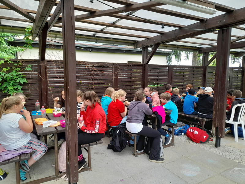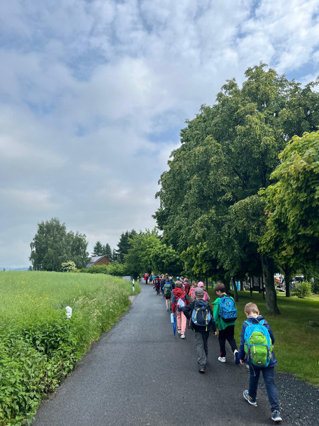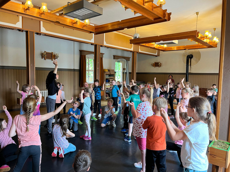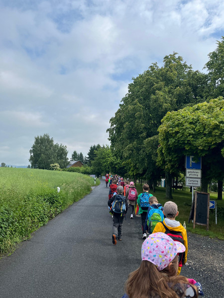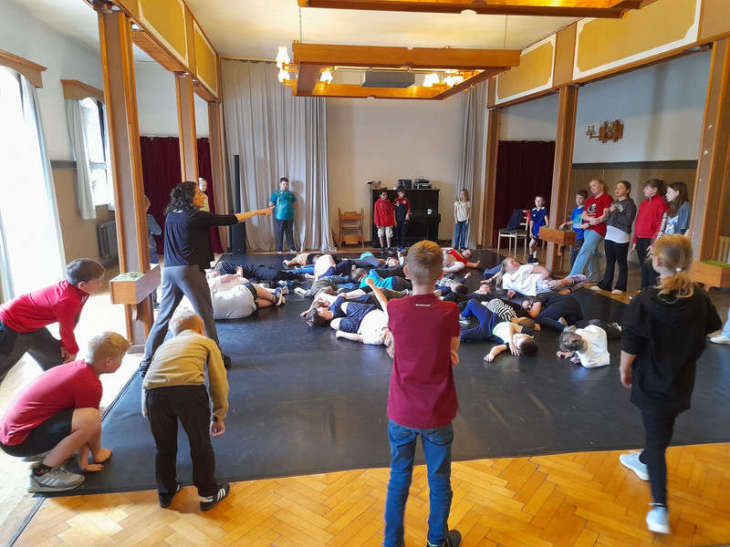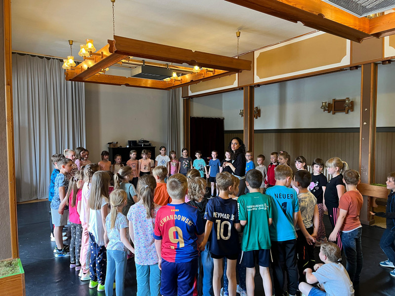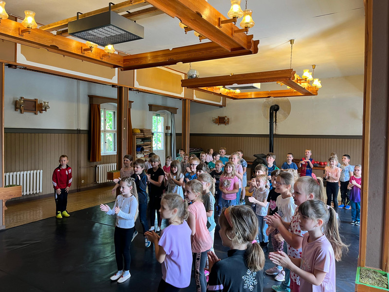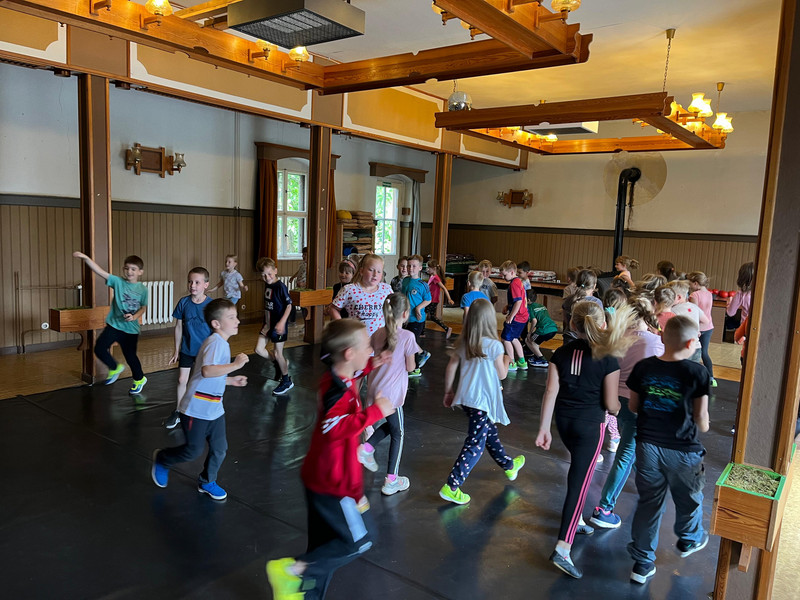 So ging es mit einer kleinen Wanderung nach Kleinhennersdorf zur Heymannbaude los. In der Heymannbaude erwarteten uns Herr Torsten Haubold und Frau Helena Fernandino. Zur Musik verwandelte sich diese in eine kreative Bühne. Die Kinder stellten Sachen oder Gegenstände, wie zum Beispiel eine Brücke oder Wasser, nur mit ihren Körpern dar. Beim freien Tanzen zur Musik durfte jeder beim Stopp eine Pose einnehmen. In den selbstgewählten Posen zeigten die Kinder, wie vielfältig und ausdrucksstark freies Tanzen sein kann. Die Kinder bauten eine Kette. Dabei nahm jedes Kind, welches dazu kam, eine Pose ein. Beim Ausführen von Bewegungsabläufen zu den Buchstaben (P und Sch) wurden Atemübungen trainiert. Jeder Buchstabe wurde 7x gesagt und dabei die Pose gewechselt. Perfektion stand dabei nicht an erster Stelle, sondern viel Einfallsreichtum und Kreativität und der Spaß kam auch nicht zu kurz. Es ist beeindruckend, wie die Kinder durch Tanz ihre Vorstellungskraft zum Leben erwecken. Nach einem Frühstück wanderten alle wieder zurück zur Schule.