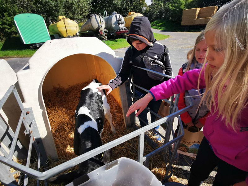 In diesem Jahr beschäftigten wir uns in der Schule mit dem Anbau von Getreide und Kartoffeln. Deshalb wollten wir auch wissen, wie die Kartoffeln in der Agrargenossenschaft geerntet werden. Leider war am vereinbarten Tage die Ernte auf dem Feld wegen des Wetters nicht möglich. So besuchten wir die Bauern in der Kartoffelhalle. Wir erlebten wie die Kartoffeln sortiert, abgesackt und gelagert werden. Außerdem beantwortete uns Herr Hering viele Fragen. Wir erfuhren unter anderem auch welche teuren Maschinen die Bauern nutzen und was ein Bauer alles können muss. Es war für viele erstaunlich, wie gut Bauern rechnen können müssen. Danach führte uns Herr Hering durch den Stall. Die meisten Kinder unserer Klasse waren besonders von den kleinen Kälbchen beindruckt.