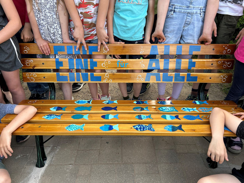 Im Rahmen der 48h Aktion in Freital haben die Kinder der Grundschule Poisental gemeinsam mit ihrer Klassenlehrerin und der Schulsozialarbeiterin eine Bank für den Schulhof gestaltet. Die „Eine für Alle“ wurde fest auf dem Schulhof integriert und soll Kindern helfen, die Hofpause in Gemeinschaft zu verbringen. Wer einen Spielpartner sucht, setzt sich auf die Bank oder schaut, wer dort schon sitzt und ebenfalls sucht. Spielpartner können sich so schneller, effektiver und konfliktfreier finden. Ausgrenzung kann leichter vermieden und Inklusion stärker gefördert werden. Natürlich hatten die Drittklässler auch einen Riesenspaß bei der künstlerischen Ausgestaltung. Jedes Kind aus der Klasse durfte seinen eigenen Fisch auf der Bank gestalten, um so das „Schwarmprinzip – gemeinsam sind wir stärker“ noch zu verdeutlichen. Auch die anderen Kinder der Schule waren begeistert und die Bank wird fleißig genutzt!