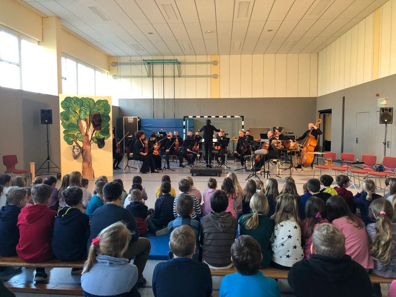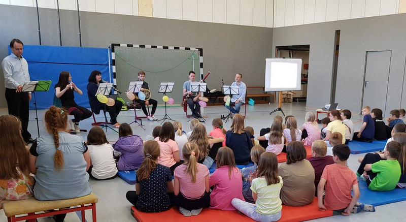Am Kindertag wurden die Schüler*innen unserer Schule mit einer besonderen musikalischen Variante von „Peter und der Wolf“ überrascht. Zu Gast in der Turnhalle war das Ensemble Senza Sogno. Die Musiker, unter Ihnen auch unsere Frau Richter mit ihrer Oboe, stellten ihre Instrumente vor und brachten uns die Handlung der Geschichte damit nahe. Außer der Oboe konnten wir noch erfahren wie ein Fagott, eine Querflöte, die Klarinette und das Horn klingen. Vielleicht hat ja auch jemand Lust bekommen, selbst ein solches Instrument zu erlernen. Die Kinder waren aufmerksam und verfolgten das Geschehen sehr interessiert. Schön war auch, dass die Vorschüler*innen aus Sacka, Schönfeld und Ponickau da waren.