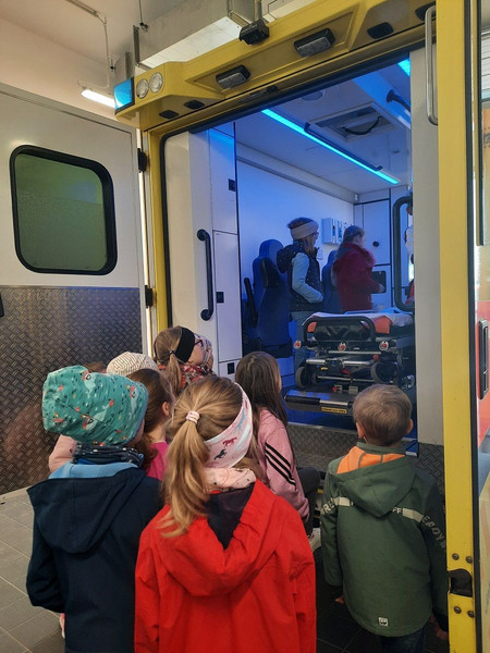 Die zweiten Klassen beschäftigten sich im Sachunterricht mit Besonderheiten und öffentlichen Einrichtungen in den Orten unserer Gemeinde. Zwei dieser Einrichtungen wollten wir uns selbst ansehen. Deshalb fuhren wir am 24. April nach Thiendorf mit vielen Fragen im Gepäck. Dort besuchten wir zuerst die Gemeindeverwaltung. Wir wurden persönlich vom Bürgermeister empfangen. Herr Mocker erklärte uns die Aufgaben eines Bürgermeisters und beantwortete all unsere Fragen. Im Anschluss daran besuchten wir die neue Rettungswache. Auch hier wurden geduldig alle Fragen von den Rettungssanitätern Daniel, der an seinem freien Tag für uns in die Wache kam, und Annabell beantwortet. Danach führten sie uns durch die Räume. Das Highlight war natürlich der Rettungswagen, den wir von außen und innen bestaunen durften. Wenige Augenblicke vor dem Ende unseres Besuches ging tatsächlich ein Notruf ein und schon setzte sich der Rettungswagen in Bewegung. Wir danken dem Bürgermeister und den Rettungssanitätern, dass sie uns einen Einblick in ihre Arbeit ermöglichten.