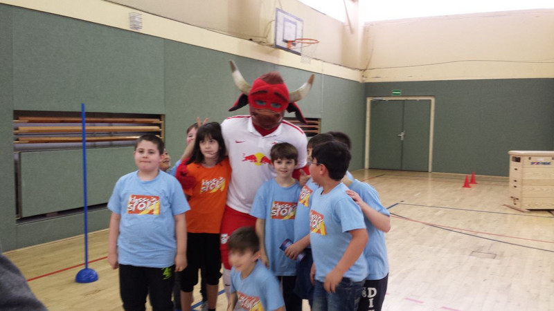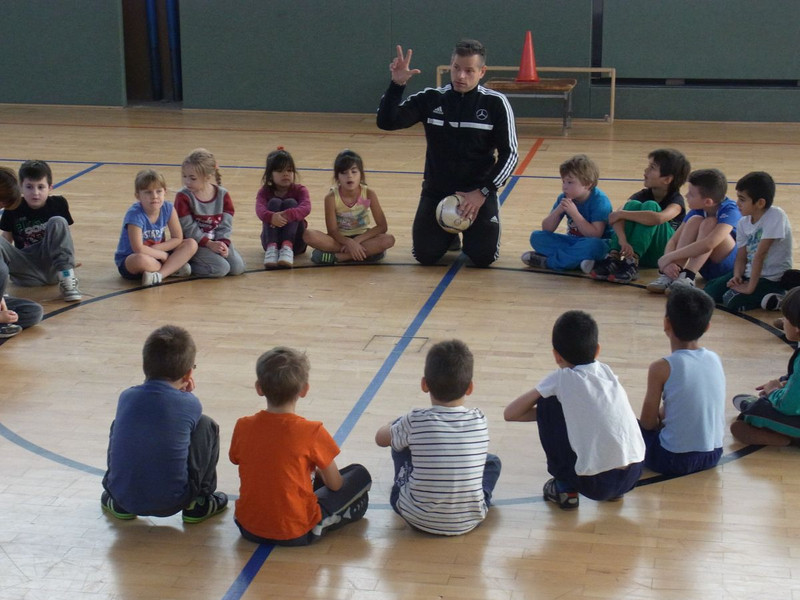 Auch der DFB hat sich in der letzten Woche in unserer Schule vorgestellt. Die Klasse 1b konnte das DFB-Mobil bestaunen,und zwei Fußballtrainer beantworteten viele Fragen, bevor sie mit ihrer Abenteuer-Fußball-Show die Erstklässler in ihren Bann zogen. Es wurden Nasenbären im Zoo gejagt, Bälle mit Fuß, Hand und anderen Körperteilen in Fußballstadien und Tribünen hin und her transportiert, am Lagerfeuer palavert, und, und, und…. Wie im Fluge verging der Unterricht und als am Ende alle Schüler noch das original DFB-Poster erhielten, waren alle glücklich und geschafft zugleich.