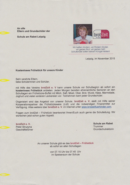 Wir werden am 19.11.2015 mit unserer Aktion brotZeit beginnen. Elterninformationsbriefe und Flyer werden noch verteilt.