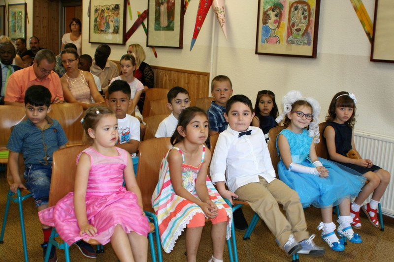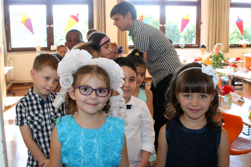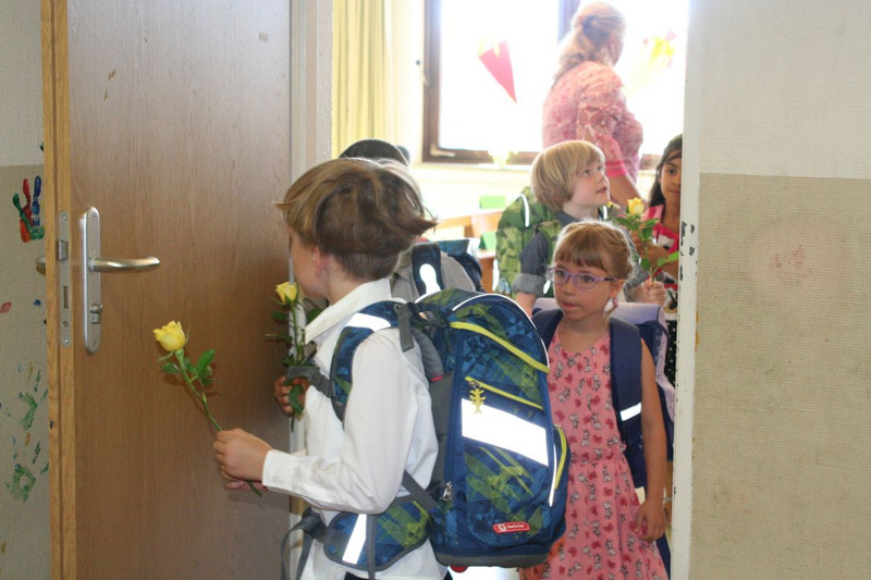 Einer der schönsten Tage eines Schuljahres fand am Samstag, 5. August 2017 statt. Schulleiterin Frau Trummer begrüßte 65 stolze ABC-Schützen der Klassen 1 a, 1 b und 1 c und deren Eltern. Sie werden von den Klassenlehrern Herrn Hähnel, Frau Hainke und Herrn Schäfer unterrichtet. Nach einem musikalischen Programm der 3. Klassen lernten die Erstklässler ihre neue Lehrerin bzw. ihren neuen Lehrer kennen und sahen sich das Klassenzimmer an. Einige sangen ein Lied, andere durften sogar schon ihren Namen an die Tafel schreiben oder an einem kleinen Kennenlernspiel teilnehmen. Nach dem offiziellen Klassenfotos auf unserer Schultreppe hieß es: Auf die Zuckertüte, fertig los!