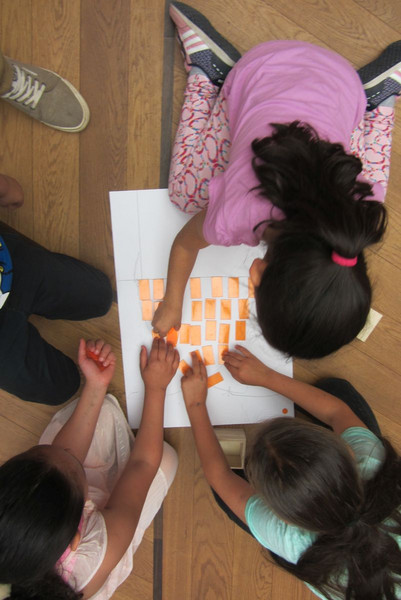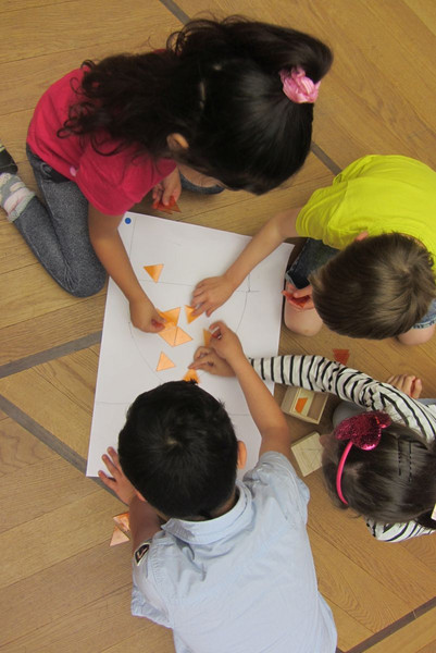 Natürlich versuchten die Schüler gleich selbst Formen und Muster zu legen. Nachdem in Gruppen ein Spitzbogen gezeichnet wurde, wurde dieser mit verschiedenen Formen ausgelegt.