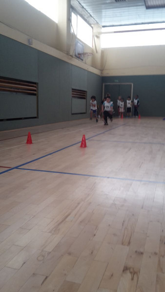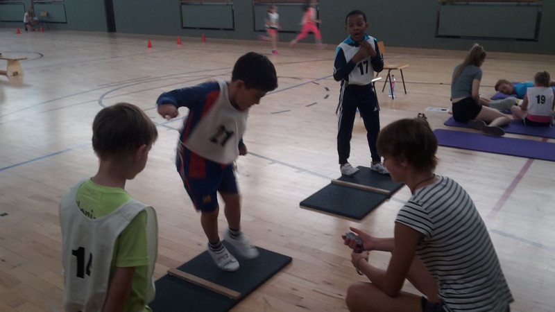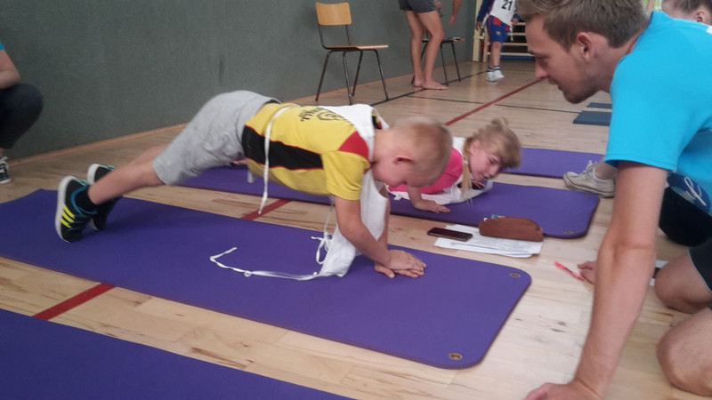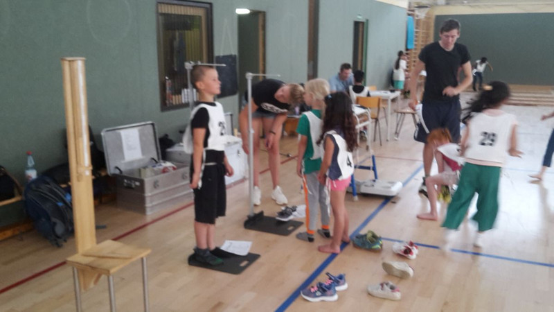 So sollten sie balancieren (vorwärts und rückwärts), 20 m rennen, aus dem Stand weit hüpfen, seitlich hin - und herspringen sowie Rumpfbeuge, Liegestütz und Sit-ups machen. Zwischendurch wurde auch die Größe, Gewicht und der Blutdruck gemessen. Zum Schluss wartete noch ein 6-min-Lauf auf die Kinder.