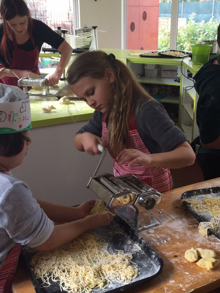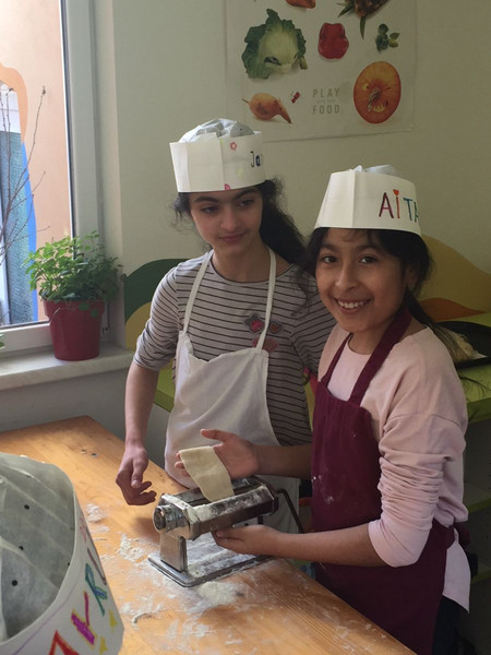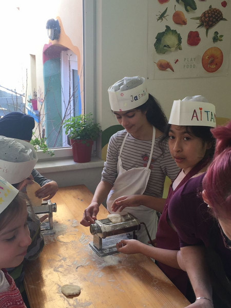 Für die Kinder war es sehr spannend an der Entstehung verschiedener Nudeln (aus Mehl und Ei oder Hartweizengries) beteiligt zu sein. Da fast alle Kinder gefüllte Nudeln bereits aus ihrer Heimat kennen, war es einen besonderen sprachlichen Austausch wert. Es war schön zu sehen, dass sie diese Gemeinsamkeit feststellten.