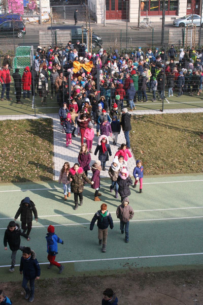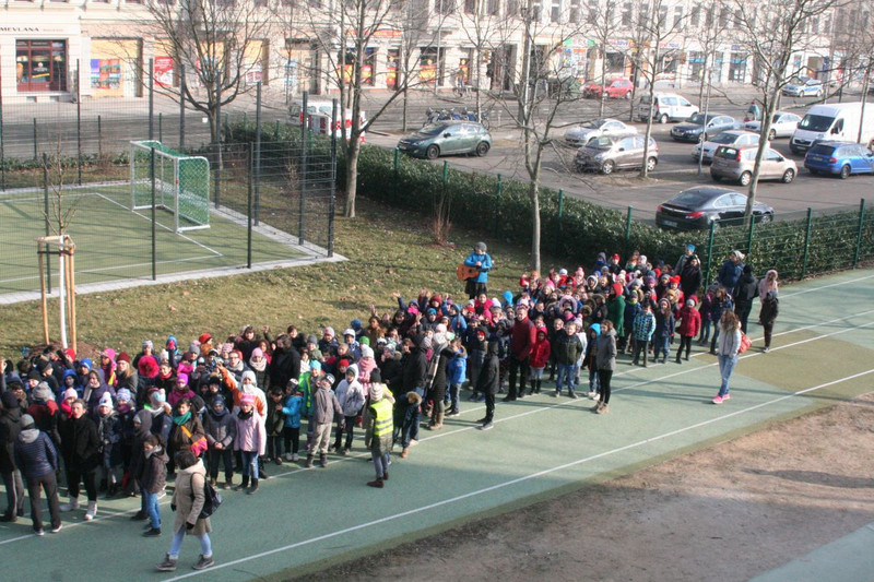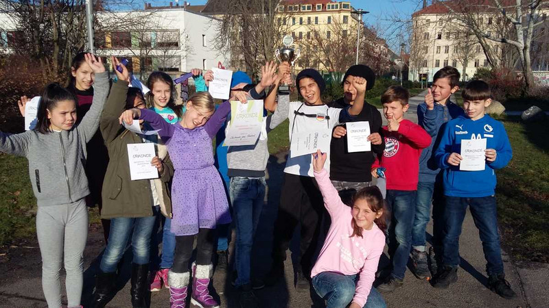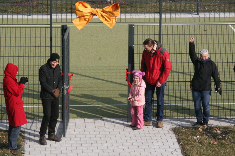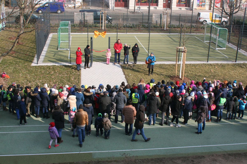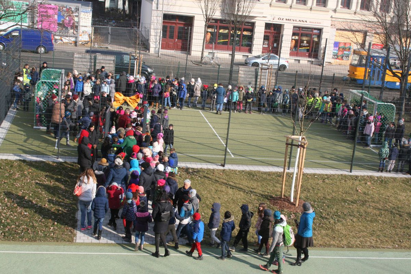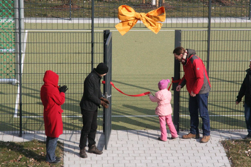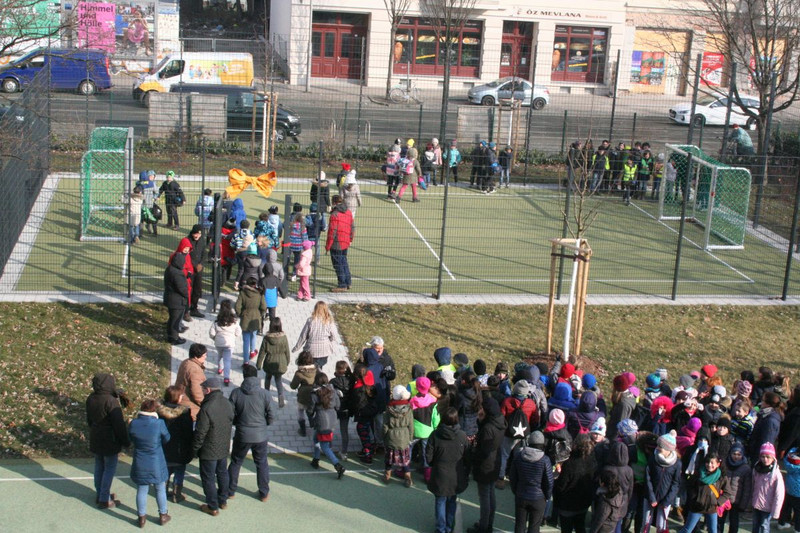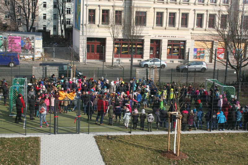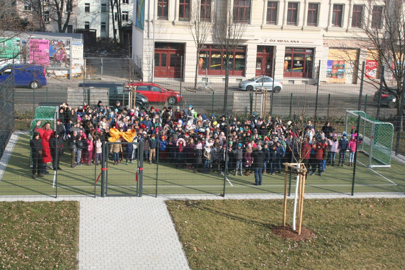 Mit einer kleinen Eröffnungsveranstaltung weihte sie zusammen mit dem Elternrat und allen Kindern der Schule den Bolzplatz am 2. März ein. Seitdem ist die Nutzung in der 1. Hofpause so geregelt, dass alle Mädchen und Jungen abhängig von ihrer Klassenstufe nach einem abgestimmten Zeitplan unbekümmert die neue Sportmöglichkeit nutzen können. Ab der 2. Hofpause nutzt der Hort den Bolzplatz.