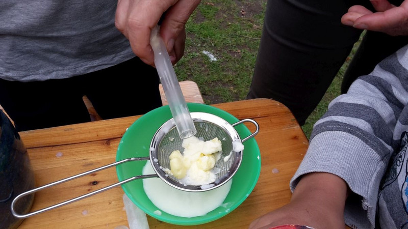 Butter selber machen war toll. Es ist ganz schön anstrengend und erfordert einige Geduld bis aus Sahne Butter wird. Die selbst gemachte Butter hat uns am Schluss gemeinsam mit Honig und Schafskäse besonders gut geschmeckt.