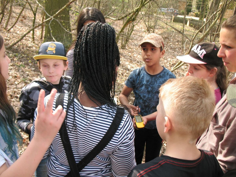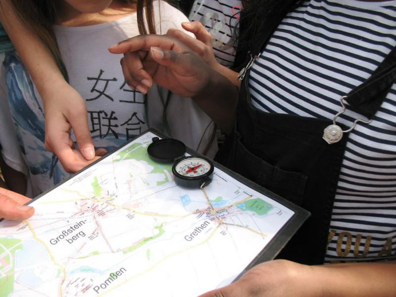 Nach dem Mittagessen stand Geocaching auf dem Programm. Mit Hilfe eines GPS-Geräts mussten verschiedene Dosen mit Fragen gefunden werden, die am Ende den Fundort eines Schatzes preisgaben. Wir waren mit Eifer dabei und freuten uns am Ende über die gefundenen „Goldtaler“.