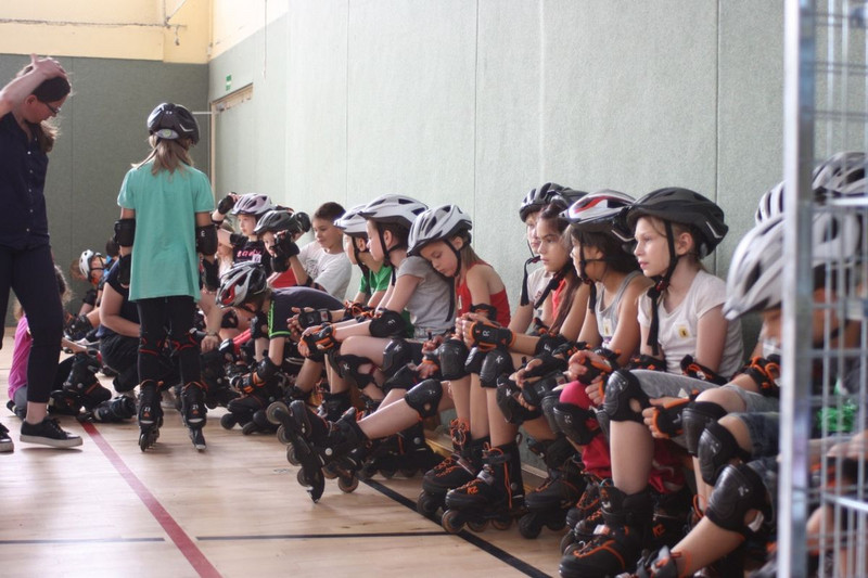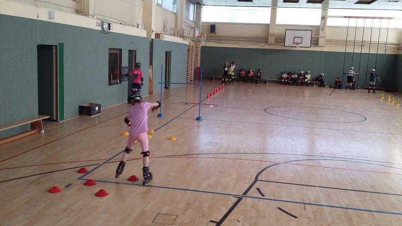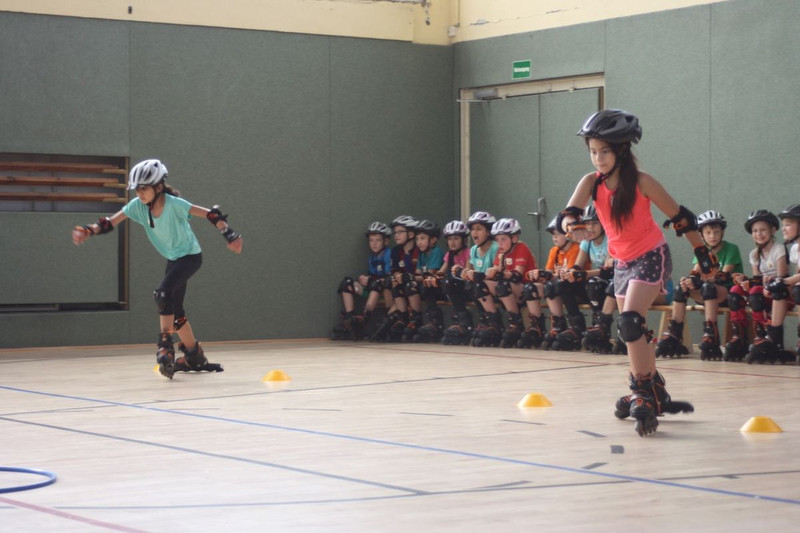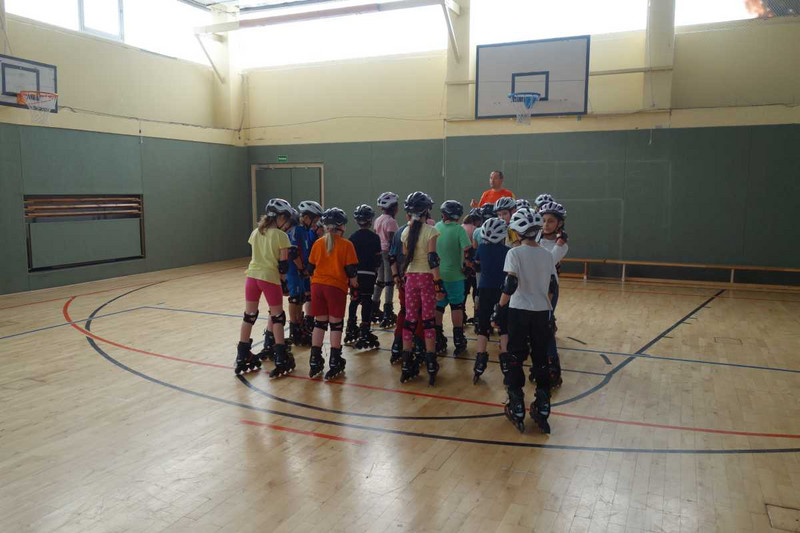 Ca. 75 Schüler erhalten in einer Unterrichtsstunde eine spielerisch gestaltete Unterweisung auf Inlineskates und sollen so ihre Fähigkeiten und Fertigkeiten auf Skates verbessern.