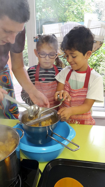 Nach einer kurzen Einweisung und natürlich Hände waschen ging es los. Hier wurden Kartoffeln und Möhren geschnibbelt, dort Streusel geknetet, andere pellten Kartoffeln ab, wiederum andere pressten Apfelsaft. Keinem wurde es langweilig, denn zu tun gab es genug. Schließlich sollte am Ende ein 4-Gänge-Menü zubereitet werden.