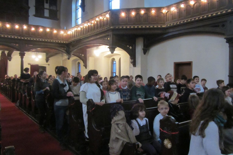 Der Abschluss der Adventszeit bildetet wie jedes Jahr das gemeinsame Weihnachtsliedersingen in der Heilig-Kreuz-Kirche. Geleitet wurde die Veranstaltung von unserer Musiklehrerin Frau Müller, die tatkräftig von Frau Heinrich, der Gemeindepädagogin, und dem Schulchor unterstützt wurde. Gemeinsam mit allen Schülern, Eltern, Omas und Opas, Geschwistern und weiteren Besuchern wurden viele Weihnachtslieder gesungen, Beiträgen der Klassen gelauscht und zuletzt die Weihnachtsgeschichte, die die Religionskinder der 3./4. Klasse aufführten, bestaunt. Der Weihnachtsklassiker "Feliz Navidad" durfte natürlich am Ende nicht fehlen.