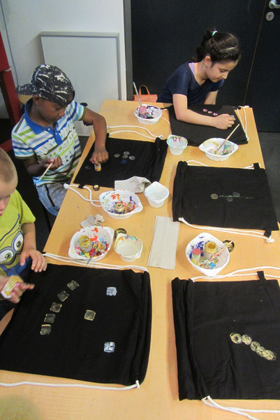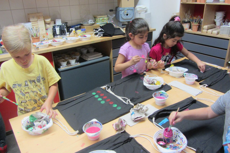 Das Highlight war jedoch zum Schluss das Stempeln von Rucksäcken mit verschiedenen Formen. Konzentriert und mit großer Freude stempelte jedes Kind seinen eigenen Rucksack.