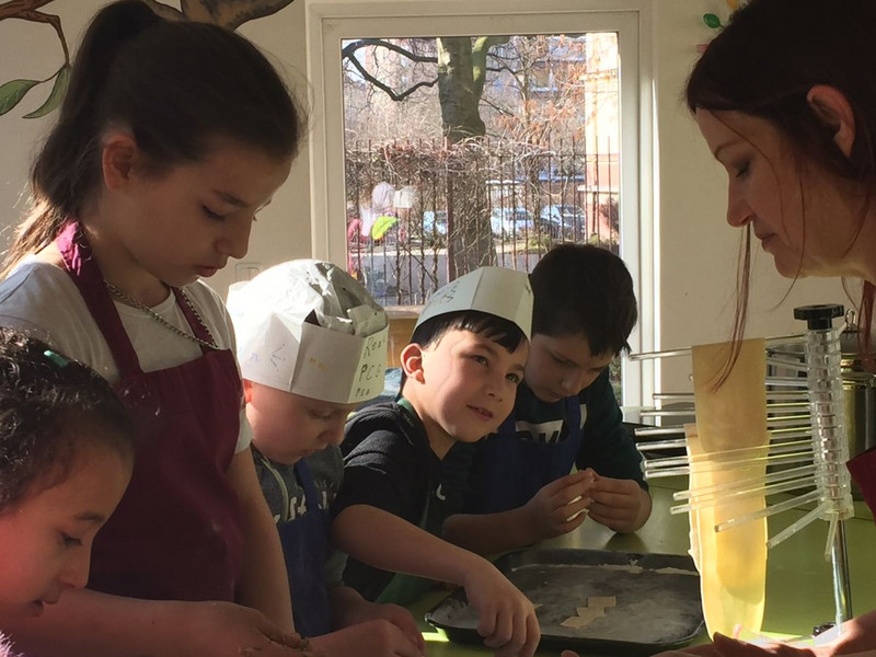 Heute erlebten die DaZ-Kinder einen wunderbaren Tag im Kinder-Erlebnis-Restaurant. Die DaZ-Schüler aus der 2., 3. und 4. Klassenstufe durften sich selbst aussuchen, in welchem Team und mit welcher Aufgabe sie beginnen wollten. In zwei Küchen wurde dann Nudelteig hergestellt, der später ausgerollt und zugeschnitten wurde. Dazu sollten eine schmackhafte Tomaten- sowie eine Schmandsoße und als Vorsuppe eine Gemüsesuppe mit Sternchennudeln gezaubert werden.