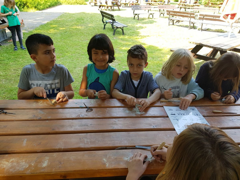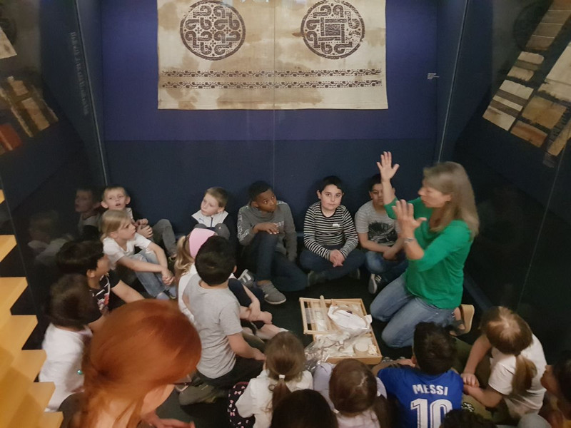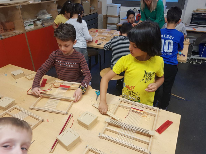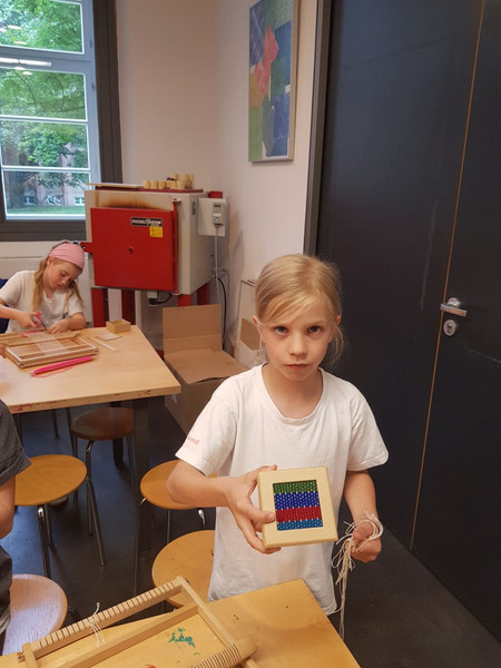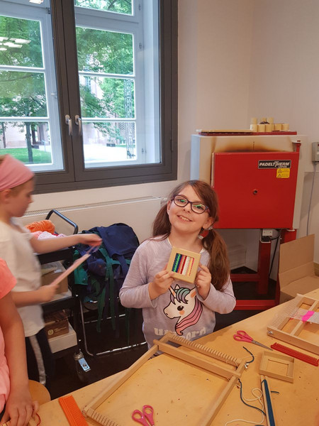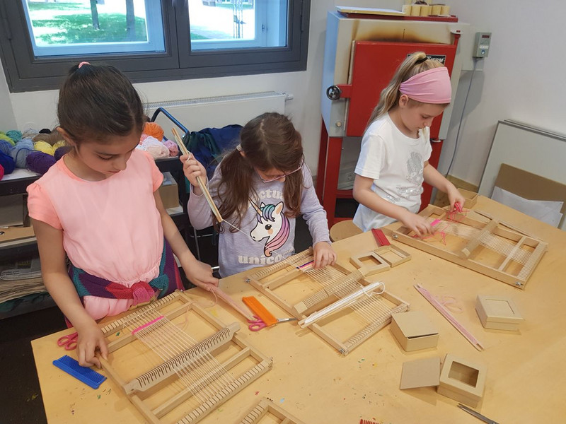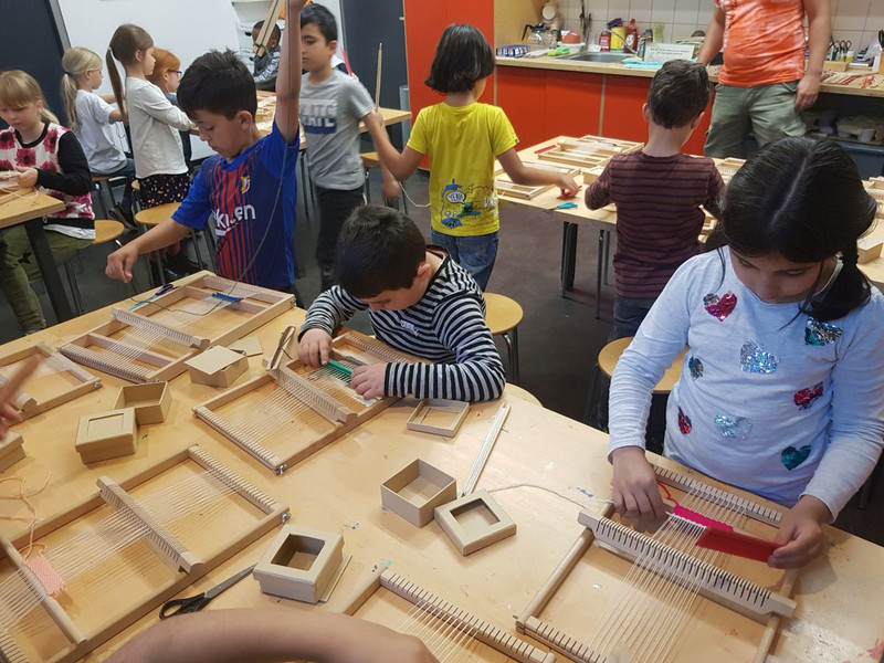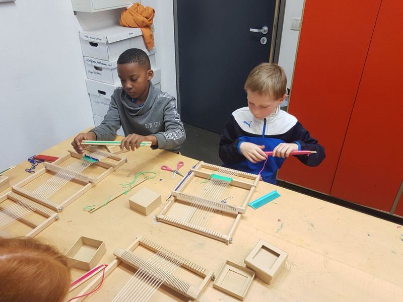 Nach dem Besuch der Ausstellung und einer kleinen Stärkung durften die Schüler in der Werkstatt selbst aktiv werden. Dort webten sie ein eigenes kleines Stück Stoff, mit dem sie eine kleine Schachtel verschönerten. Das war für einige Kinder doch ganz schön sehr herausfordernd. Aber glücklich hielt am Ende jeder von ihnen eine kleine Schachtel in den Händen.
