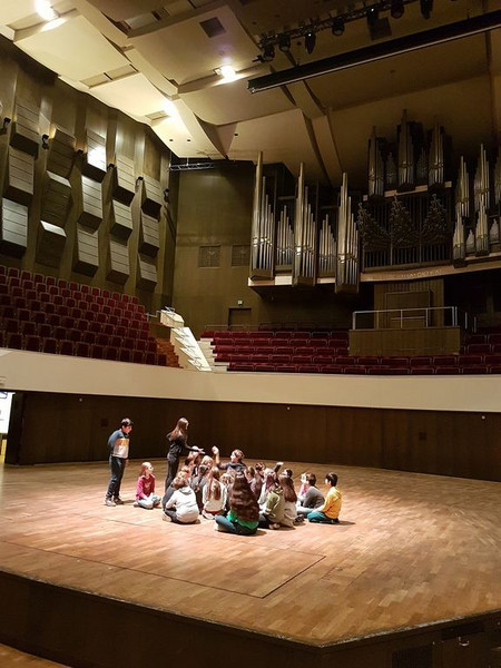 Dieser Besuch war kein gewöhnlicher, denn wir bekamen eine „Spezialführung“ durch das Gewandhaus. Frau Deutsch, Musikvermittlerin des Gewandhauses, führte uns alle Treppen nach oben. Aber noch nicht genug! Durch einen Geheimgang ging es noch mindestens 60 Stufen weiter nach oben bis auf die Decke des großen Saales. Dort dürfen sich normalerweise nur die Bühnentechniker aufhalten. Durch Luken in der Decke konnten wir bis in den Saal schauen, das war ganz schön hoch. Daraufhin schauten wir uns die Modelle der zwei „Vorgängergewandhäuser“ im Foyer an, bevor wir in den großen Saal gingen. Dort liefen alle Kinder bis nach hinten auf die letzten Plätze. Selbst dort oben war die geflüsterte Nachricht von Frau Deutsch och zu verstehen. Echt eine fantastische Akustik. Zum Abschluss sangen noch alle das russische Lied vom Tännlein auf der großen Bühne des Gewandhauses bevor es wieder zurück zur Schule ging.
