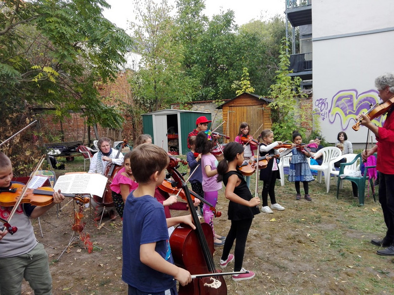 Zu Beginn der Herbstferien gestalteten der Chor der Schule zusammen mit dem Gewandhaus und dem Verein Stadtpflanzer e.V. im Stadtteilgarten „Neustädter Straße“ ein „Herbstliches Zwergenkonzert“.