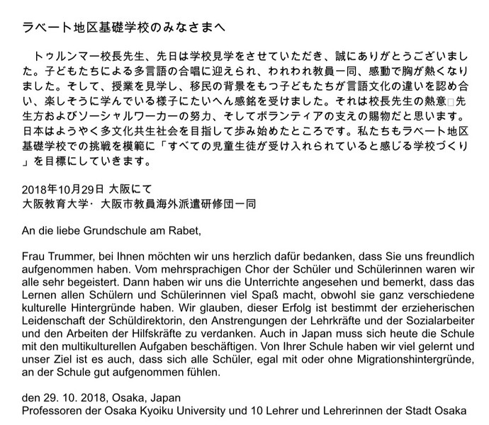 Im Oktober begrüßten wir eine japanische Delegation. Die Vertreter der Hochschule in Osaka informierten sich interessiert über unsere Schule. Ein Auftritt der Chorkinder unter der Leitung von Frau Müller begeisterte die Gäste.