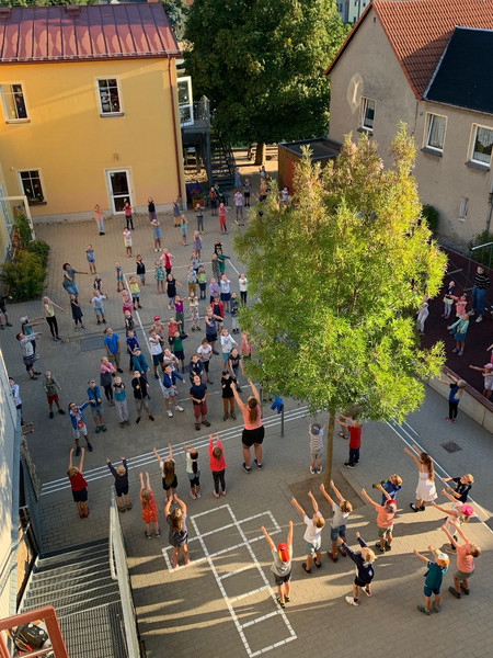 Am Freitag, dem 8. September, startete unser neues Projekt mit sportlichen Übungen mit Musik auf dem Hof. Allen Kindern bereitete dies große Freude.