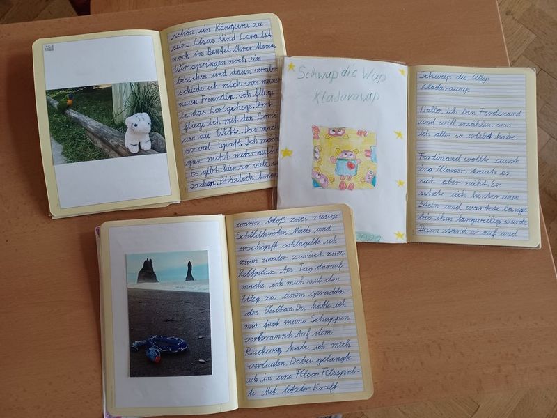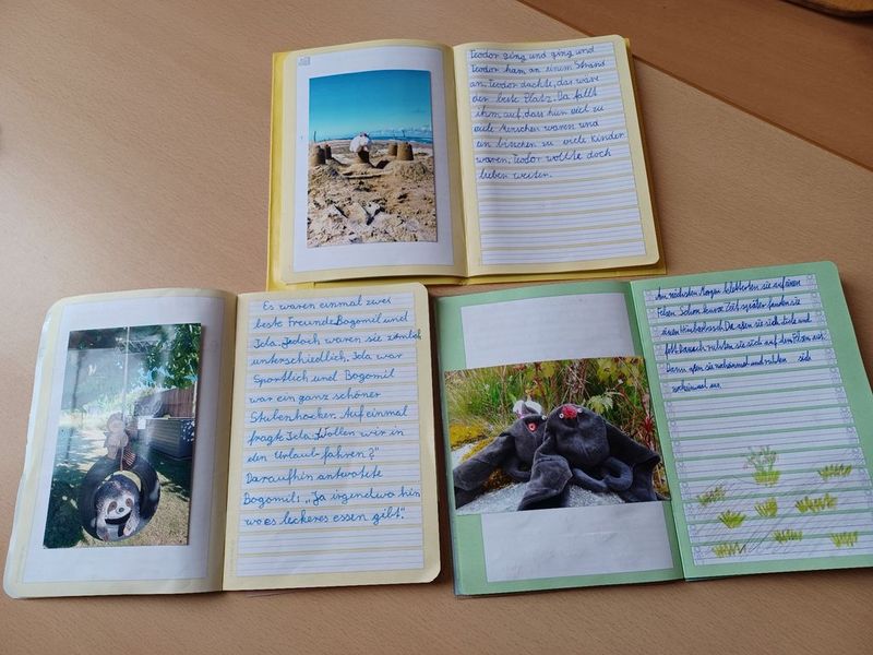 Im Deutschunterricht Klasse 3 entstanden sehr liebevoll geschriebene und gestaltete Geschichtenbücher zum Thema "Mein Kuscheltier auf Reisen".