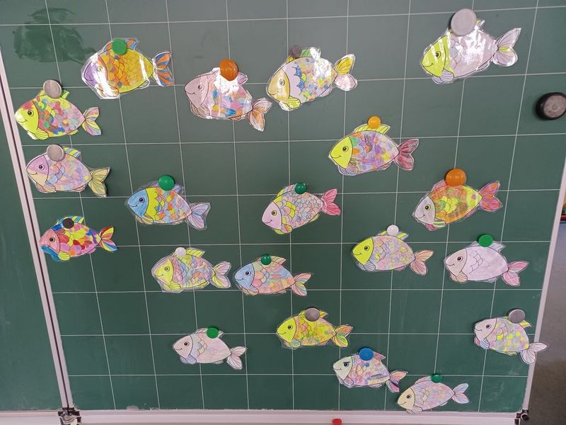 Im Werkenunterricht Klasse 1 wurden wunderschöne Lautfische im Regenbogenkleid gebastelt. Sie dienen im Deutschunterricht dazu, dass jedes Kind mit Hilfe einer Wäscheklammer zeigen kann, wo im Wort es einen bestimmten Laut hört: am Anfang - in der Mitte - am Ende eines Wortes.