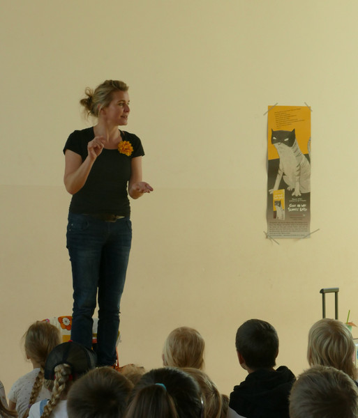 Am Freitag, dem 7. Juni war die Dresdener Kinderbuchautorin und Schauspielerin Frauke Angel in unserer Grundschule zu Gast. Sie stellte den Kindern ihr Buch "Geht ab wie Schmitz`Katze" vor, besser gesagt sie las und spielte einen Teil des Buches vor. Wer dachte, es geht um eine Katze, der dachte verkehrt: Denn die Geschichte erzählt von Familie Schmitz und vor allem Mama Schmitz, die innerhalb ihrer Familie in einen Streik tritt. Eine Katze kam natürlich auch vor. Sehr amüsant und einfallsreich wurden alle Kinder an die Geschichte herangeführt. Nun sind alle gespannt, wie die Geschichte wohl weitergeht. Aber dafür muss man das Buch natürlich lesen.