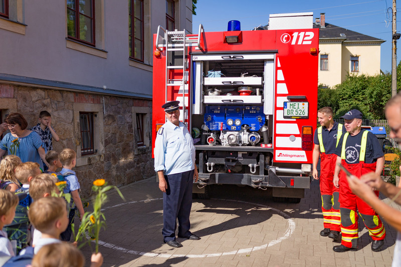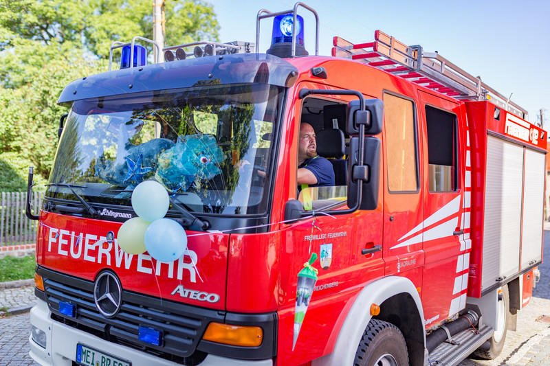 Zum ersten Mal in der Geschichte der Grundschule Reichenberg wurden am 19.08.2023 drei 1. Klassen eingeschult. Nach einem liebevoll gestalteten Programm der Viertklässler, das dieses Jahr dreimal vorgetragen werden musste, konnten nacheinander insgesamt 67 ABC-Schützen in die Klassen 1a, 1b und 1c aufgenommen werden. Dabei erhielten sie eine von den Schülern der Grundschule selbst gebastelte Willkommensplakette und eine Sonnenblume. Nach einer ersten kleinen Unterrichtsstunde im Klassenzimmer fehlte eigentlich nur noch eines: die Zuckertüte! Nirgends auf dem Schulhof konnten die frischgebackenen Schulkinder ihre Tüten finden! Da konnte nur die Feuerwehr helfen. Mit lautem Tatütata kam sie zum Schulhof und hatte natürlich für jedes Kind seine schön gestaltete Zuckertüte dabei. So war es für alle Schulanfänger und ihre Familien ein gelungener Schulstart.