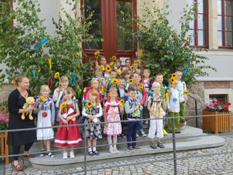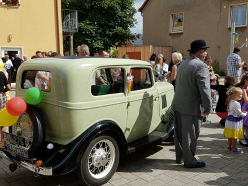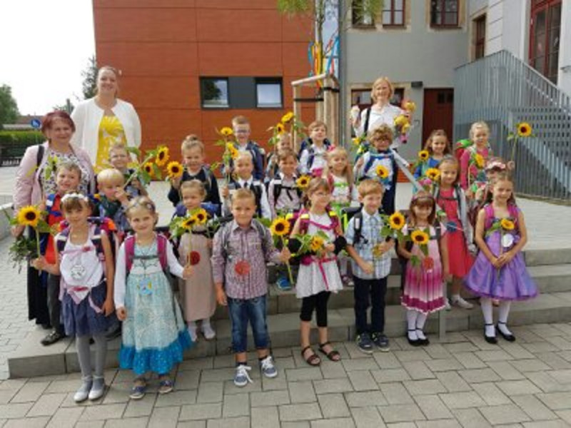 Am Samstag, dem 6. August, war es endlich soweit. 46 ABC - Schützen, die schon lange auf diesen Tag gewartet hatten, saßen erwartungsvoll auf ihre Plätzen in der Turnhalle. Zuerst sahen sie ein wunderschön gestaltetes Programm der vierten Klassen. Nach der feierlichen Aufnahme in die Klassen 1a und 1b unserer Grundschule machten sich die Schulanfänger mit ihrer Klassenleiterin auf den Weg in ihr Klassenzimmer, um ihre erste Unterrichtsstunde zu erleben. Inzwischen hatten sich auch Eltern und Gäste der Erstklässler auf dem Schulhof eingefunden, um sie gebührend zu empfangen. Doch wo waren nur die Zuckertüten? Nach einer Suchaktion war ein lautes Motorengeräusch zu hören - da waren sie, im blankgeputzten Oldtimer kamen sie auf den Schulhof gefahren. Stolz präsentierten die frisch gebackenen Schüler ihre liebevoll gebastelten und reich gefüllten Zuckertüten.
