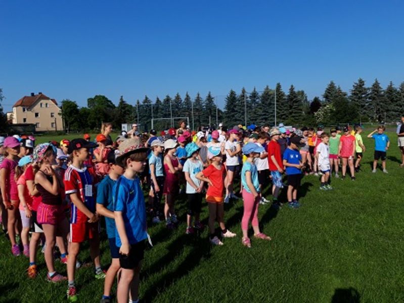Am 5. Juni trafen sich alle Schüler früh auf dem Schulhof. Dann liefen alle gemeinsam zum Sportplatz. Die ersten und zweiten Klassen waren zuerst mit der Pendelstaffel dran. Und sie gaben wirklich alles. Danach gab es etwas zu trinken und ein paar schöne Preise. In der Zwischenzeit hatten die dritten und vierten Klassen aber auch einiges geleistet. Auf dem Kunstrasenplatz gab es tolle Angebote des Sportmobils, wie zum Beispiel Basketball, Zielwerfen, Skifahren oder Sackhüpfen. Toll war auch die Hüpfburg. Jetzt gab es erstmal eine Apfelpause. Nach einer Stärkung mit Gemüse und Obst ging es weiter. Alle waren gut gelaunt und gaben wieder alles. Die dritten und vierten Klassen flitzten bei der Pendelstaffel wie der Wind los. Aber natürlich waren auch die Sportstationen wieder gut besucht. Als alle Wettkämpfe beendet waren, zog eine Glücksfee noch glückliche Kinder, die mit einem Preis nach Hause gehen konnten.