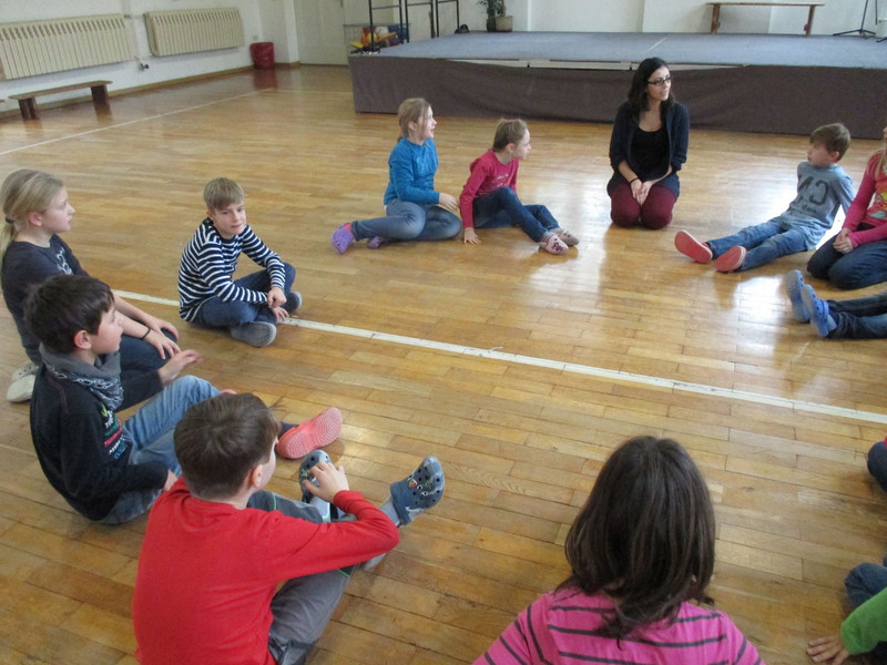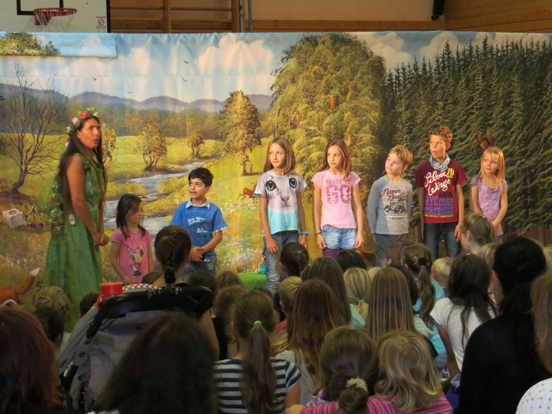 Nach 16:00 Uhr gingen wir in die Turnhalle und sahen das Musical „Das Geheimnis des Waldes“ an, wobei die Kinder auch mitspielen und -singen durften.