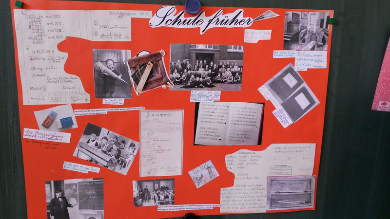 Wir haben ein Plakat gemacht für die Themen: Fahrzeuge früher, Schule früher, Kleidung früher und Wohnen früher.