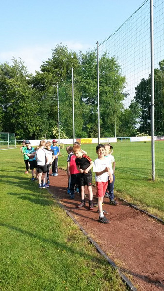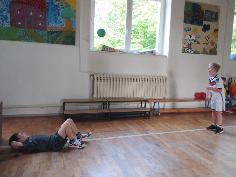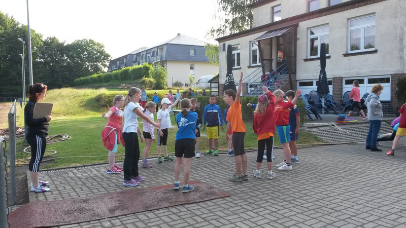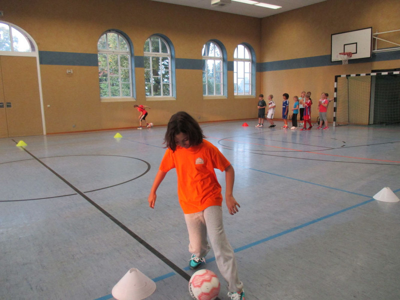 Am Anfang durften wir uns 5 Minuten einlaufen. Dann mussten wir noch mal eine Runde laufen, weil wir dann in Gruppen aufgeteilt wurden. Es gab: