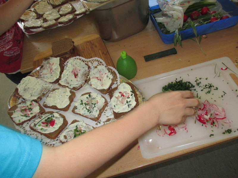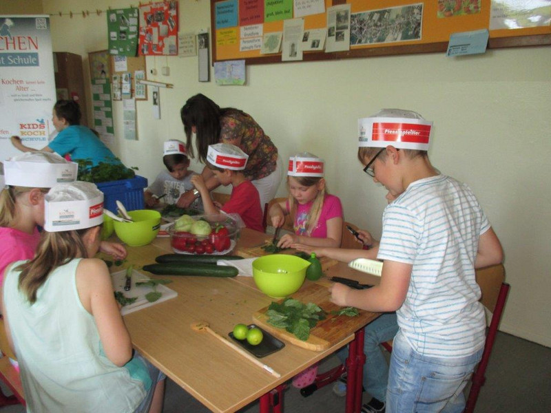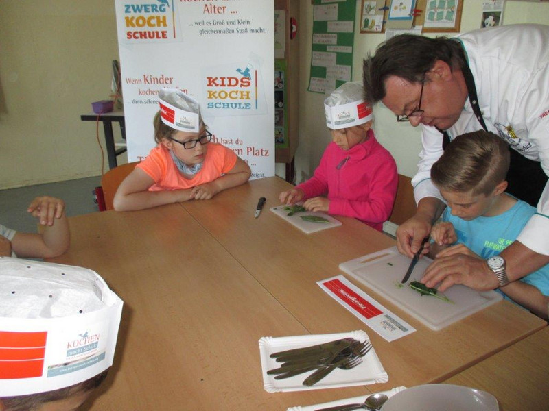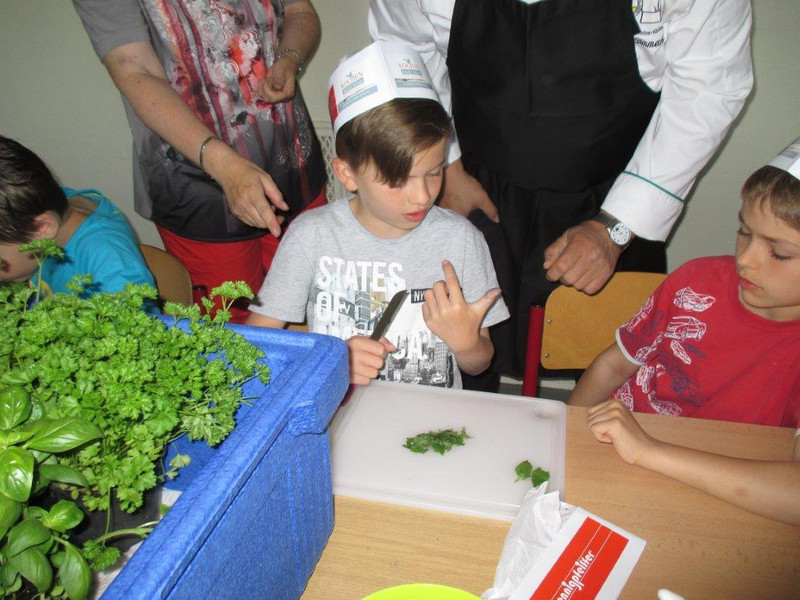 Die Kinder lernten unter Anleitung von Küchenmeister Siegmar Lämmerhirt, pensionierter Koch und Vorstandsmitglied im Chemnitzer Köcheverein 1898 e.V., verschiedene Kräuter kennen, die sie zu erfrischender Kräuterlimonade und leckeren Brotaufstrichen verarbeiteten. Als Sahnehäubchen rührten die Kreativköche eine duftende Vanillequarkspeise mit frischen Erdbeeren und Minze an.