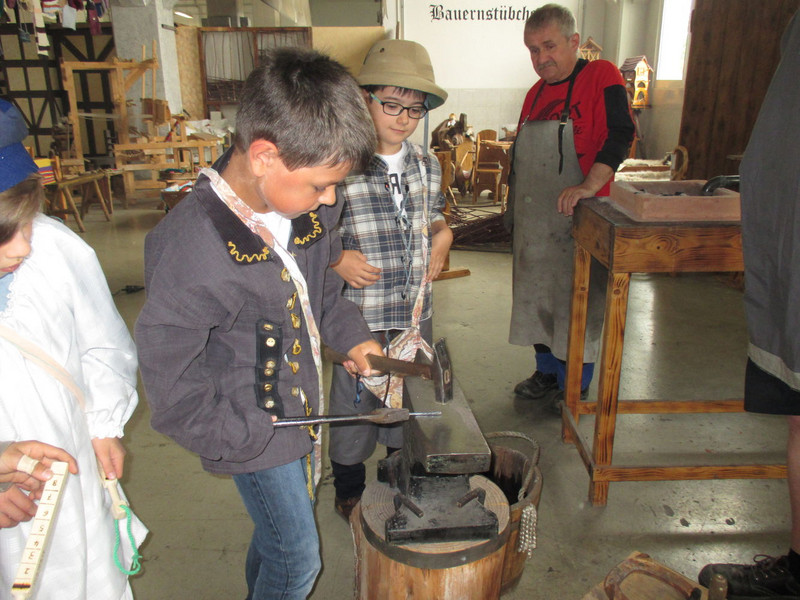 Wir haben ein Kerbholz in eine Tasche gelegt und so konnten wir wissen wie viele Stationen wir schon besucht hatten. Es gab die Stationen: Papier, Münzmacher, Kerzenzieher, Schmied, Zinngießer, Töpfern, Filzen und vieles mehr.