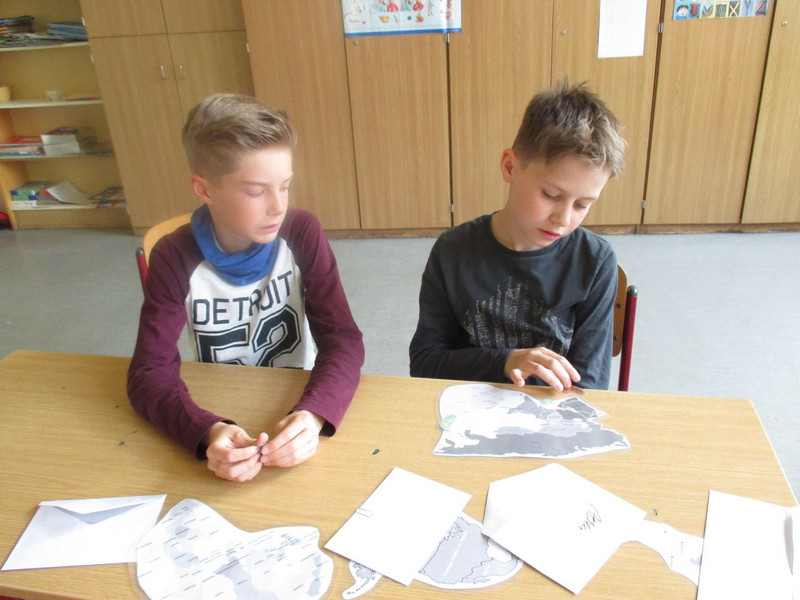 „Wir haben jeder einen Kontinent zugeteilt bekommen und sollten Material mitbringen. Ich und Justin haben die Antarktis. Jeder von uns hat ein Kuscheltier und Text oder Bilder. Als erstes haben wir ein Plakat gemacht. Und dann einen Tisch mit dem Material vorbereitet. Dort haben wir ein Puzzle und drei Fragen gemacht. In der letzten Stunde haben wir an einem Globus gearbeitet und ihn blau angemalt. Morgen werden wir einen Vortrag halten.“ Julius