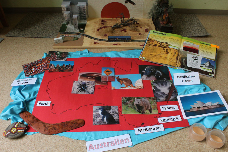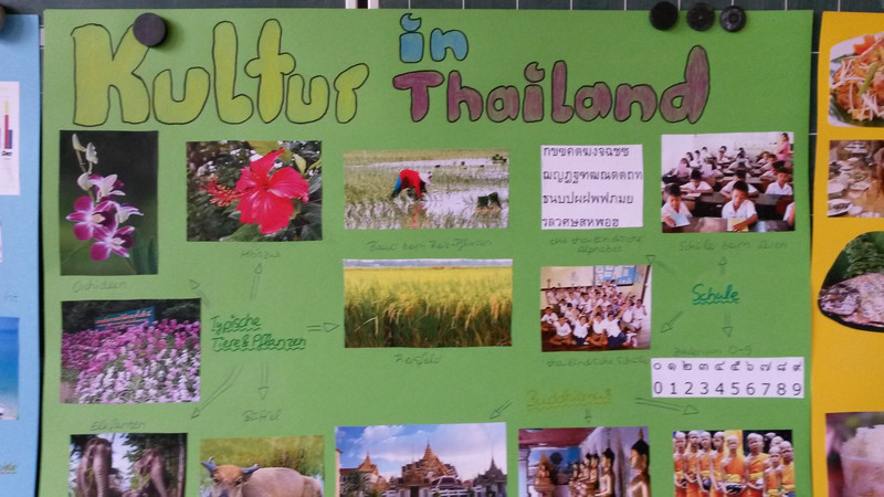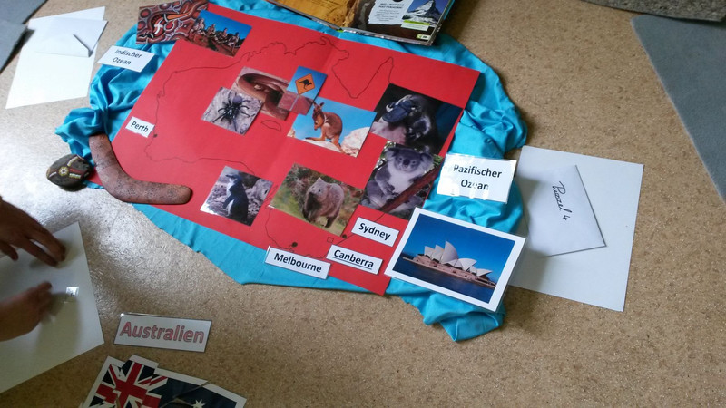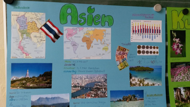 „Wir haben heute eine Stationsaufgabe gemacht, dazu hatte jeder die Hausaufgabe, Material mitzunehmen. Ich habe einen Globus und ein Weltatlas mitgenommen. Frau Böhmig hat uns am Dienstag den Kontinent Australien und am Freitag hat uns Somjai Böhm Thailand vorgestellt.“ Benno