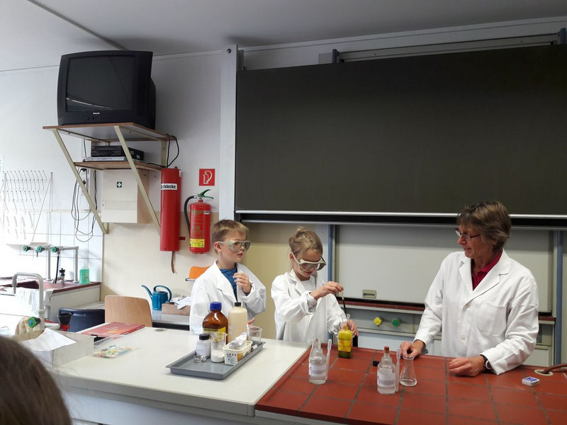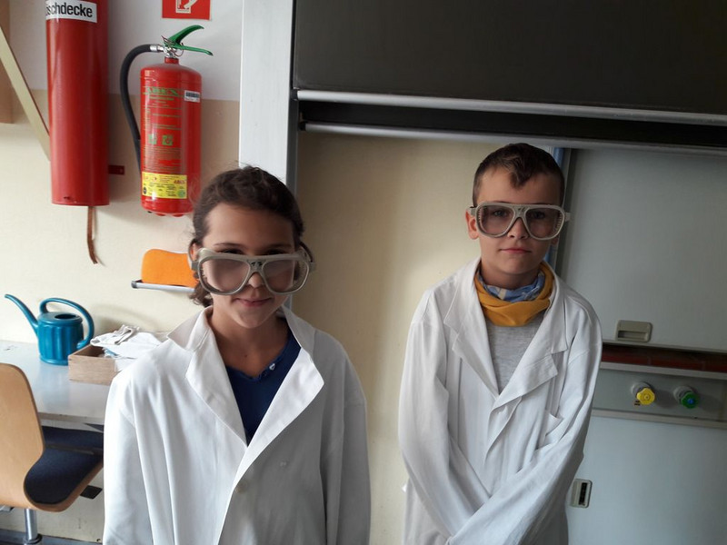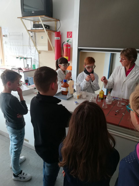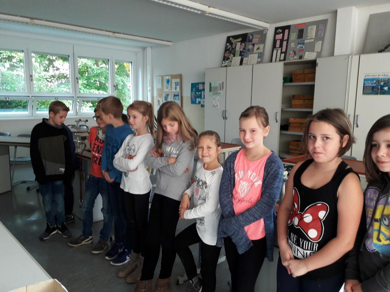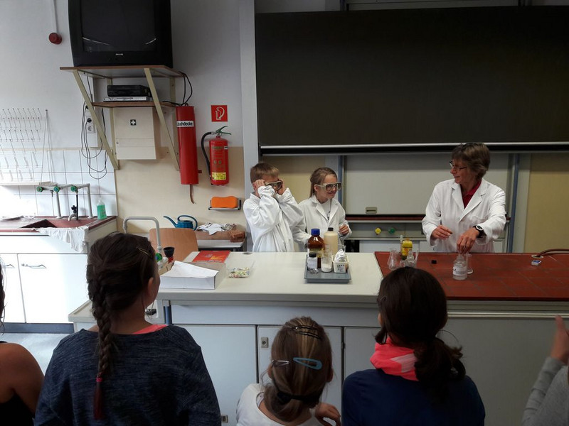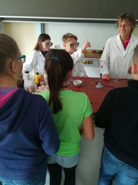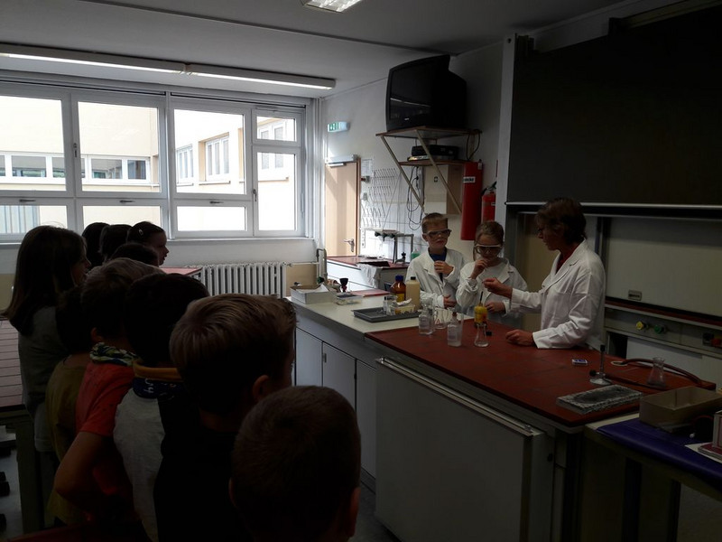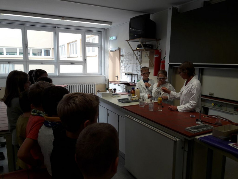 Wir fuhren dahin, weil wir in den Schnupperunterricht eingeladen worden waren. In Informatik haben wir uns in Computerspielen getestet. In Physik zeigte man uns viele Versuche und zum Schluss konnten wir alle einen Dickmann essen. In Chemie haben wir mit Chemikalien und mit Feuer gearbeitet. Der Biologielehrer zeigte uns das Innere von einer Forelle.