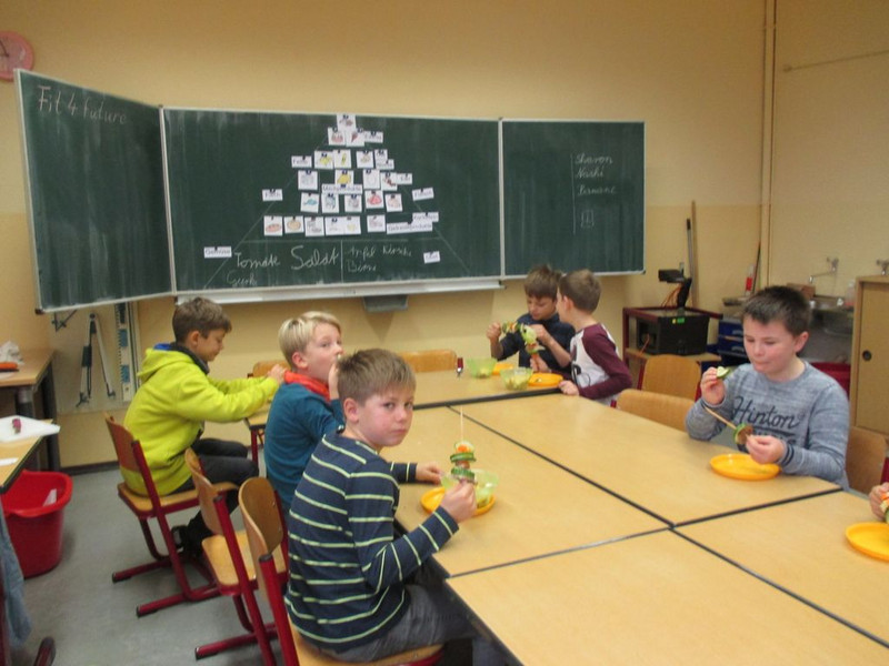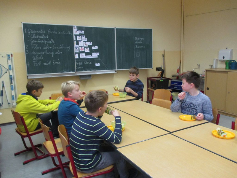 Am Mittwoch haben wir einen Film über gesunde Ernährung angeguckt und unsre neue Spielkiste bekommen. Am Donnerstag war der Zahnarzt da und wir haben die „Fit 4 future“- Kiste bekommen. Damit haben wir eine Stunde gespielt. Am Freitag haben wir ein gesundes Frühstück gemacht. Jedes Kind hat ein Spiel mitgebracht, damit haben wir zwei Stunden gespielt. In der ersten Stunde kam Eric, er zeigte uns, wie man sich entspannt.