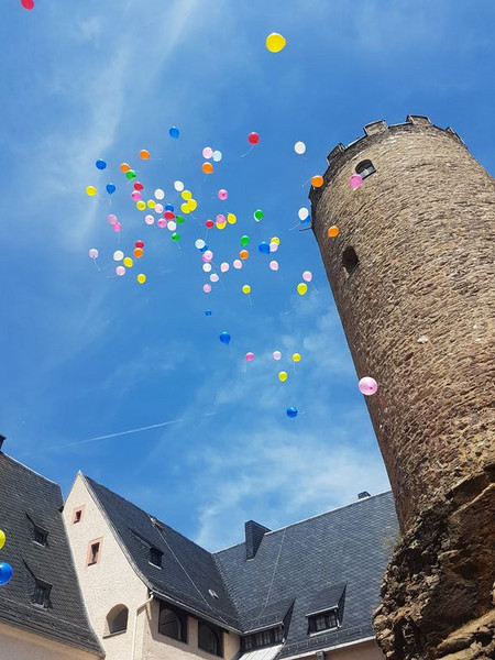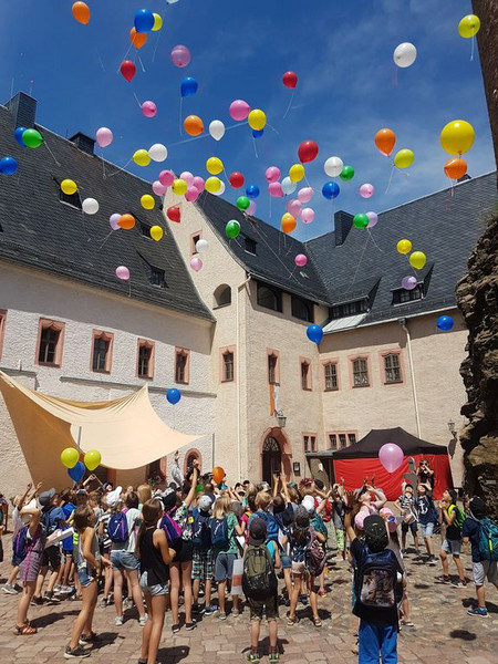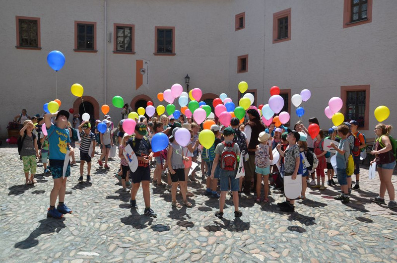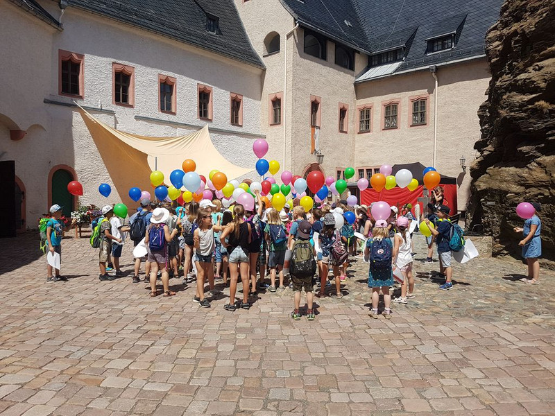 Zum Abschluss des Besuches auf der Burg Scharfenstein starteten alle gleichzeitig eine „Luftballonrakete“, vorbei am Bergfried, in die Luft mit besten Grüßen an den Schulförderverein, der die gesamten Projektkosten übernommen hat.