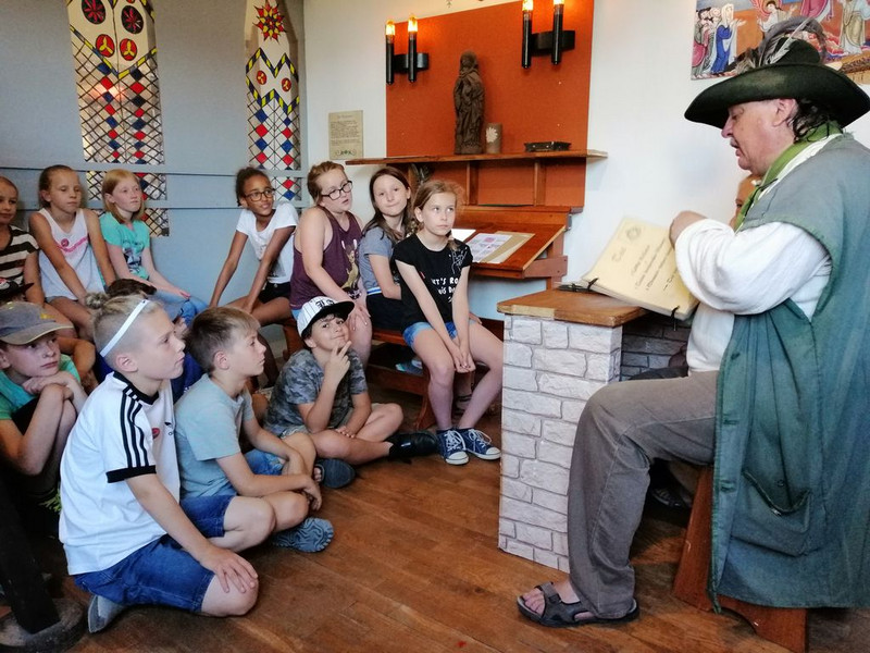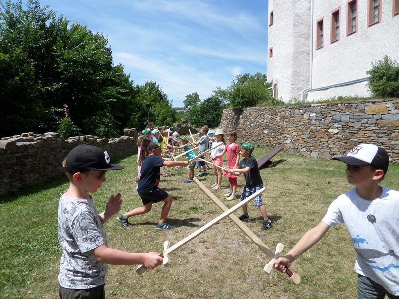Dank der Eltern, die alle Kinder zum Bahnhof nach Chemnitz brachten, starteten wir pünktlich mit der Erzgebirgsbahn in Richtung Scharfenstein. Auf der Burg angekommen, wurden wir vom Burgherrn begrüßt und mit „Jubel!“, dem mittelalterlichen Freudenruf, auf die bevorstehenden Aktionen vorbereitet.