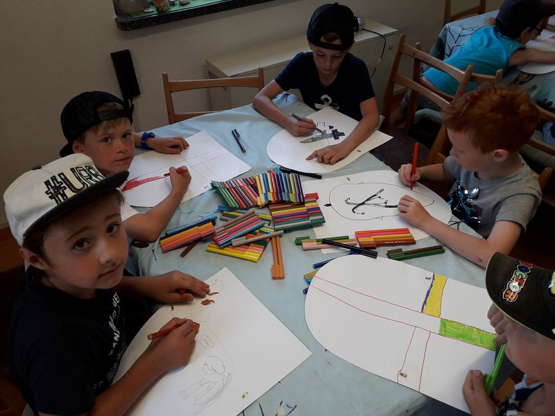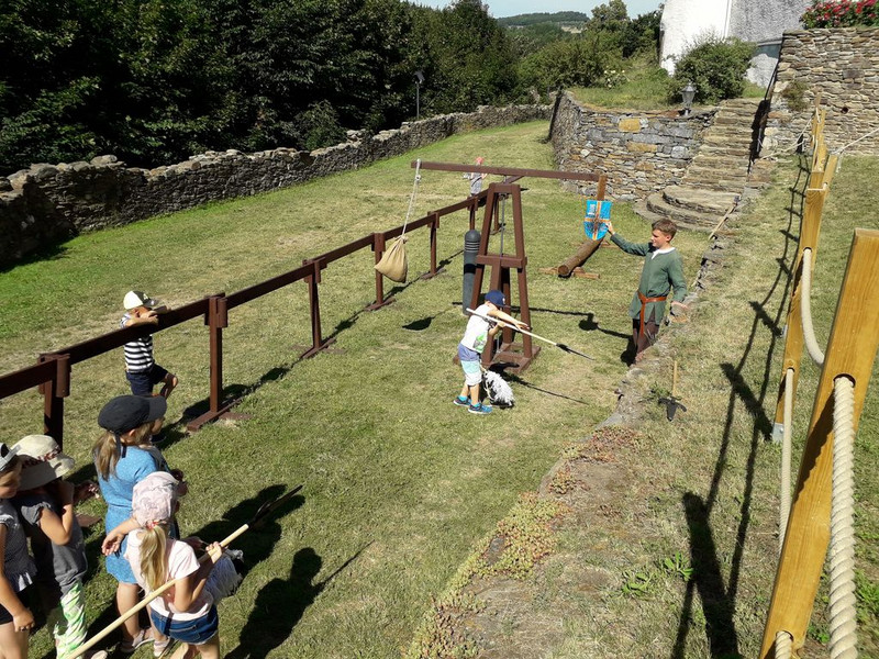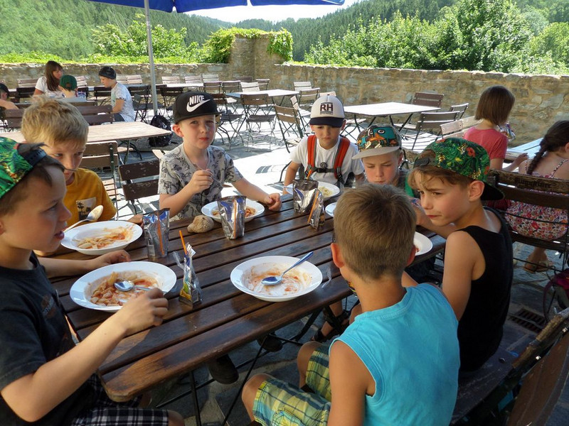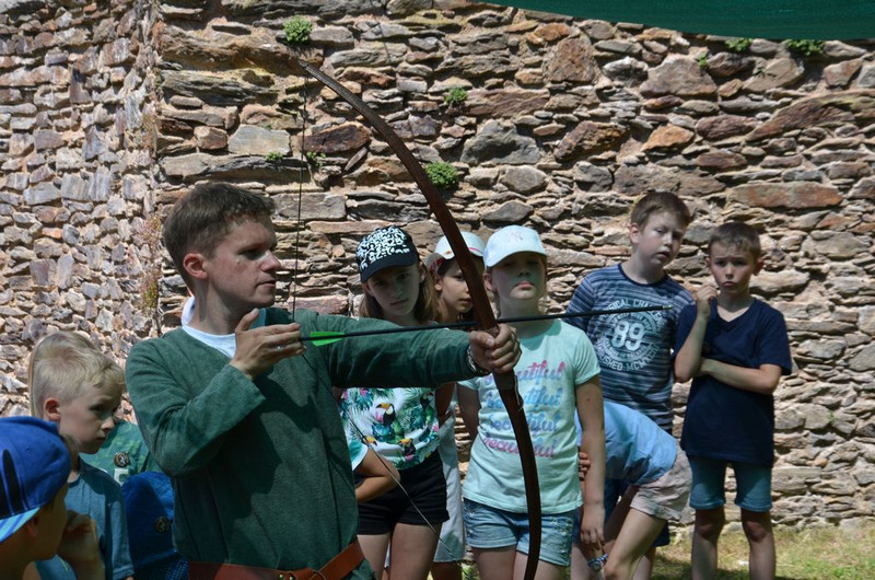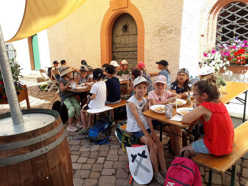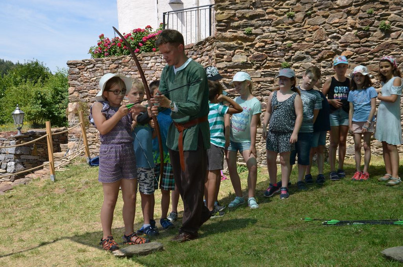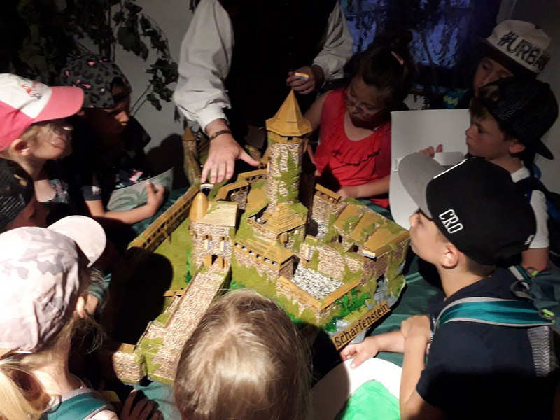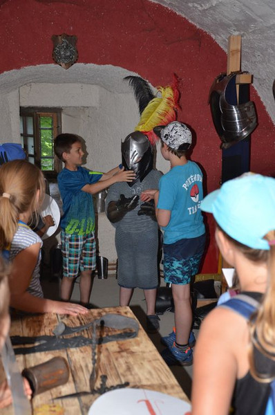 Alle Kinder konnten sich beim Bogenschießen, Schwertkampf oder Ritterturnier trotz großer Hitze sportlich betätigen und hatten viel Freude. Auch beim kreativen Gestalten eines ganz persönlichen Schilds zeigten unsere Kinder Begeisterung. Zur Abkühlung ging es zwischendurch in die mittelalterliche Ausstellung oder durch einen geheimen Gang, vorbei an Spinnen und sogar einem Skelett in den Burgkeller, in dem Teile einer Ritterrüstung anprobiert wurden. So richtig warm wurde es dann noch einmal beim Backen von leckeren Brötchen in einem Holzofen. Bei all diesen Aktionen erfuhren wir viel über das Leben auf einer Burg im Mittelalter und konnten einiges selbst ausprobieren. Die museumspädagogischen Angestellten erklärten mit Hingabe und Einfühlungsvermögen. Auch für`s Mittagessen im Burghof blieb ausreichend Zeit.