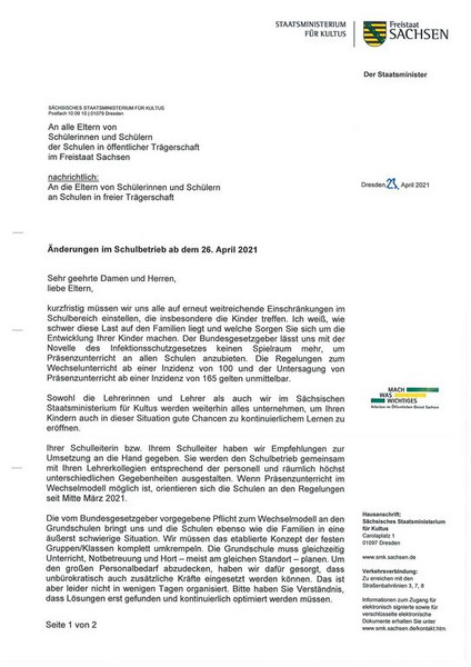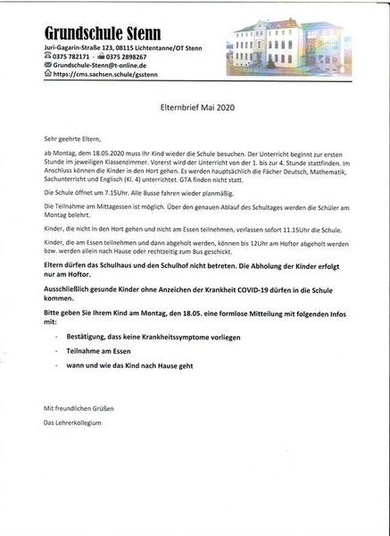 gemäß dem Erlass des Sächsisches Staatsministeriums für Kultus zu Schulfahrten und schulischen Veranstaltungen innerhalb Sachsens bis zum Ende des Schuljahres 2019/2020 vom 19.03.2020 bzw. der Ergänzung des Erlasses vom 21. April 2020 sind „schulische Veranstaltungen, die bis zum Ende des Schuljahres 2019/2020 innerhalb Sachsens durchgeführt werden sollten, [...] unverzüglich abzusagen“. Dies betrifft auch den Tag der offenen Tür, sportliche Wettkämpfe und die geplanten Klassenfahrten unserer vierten Klassen.
