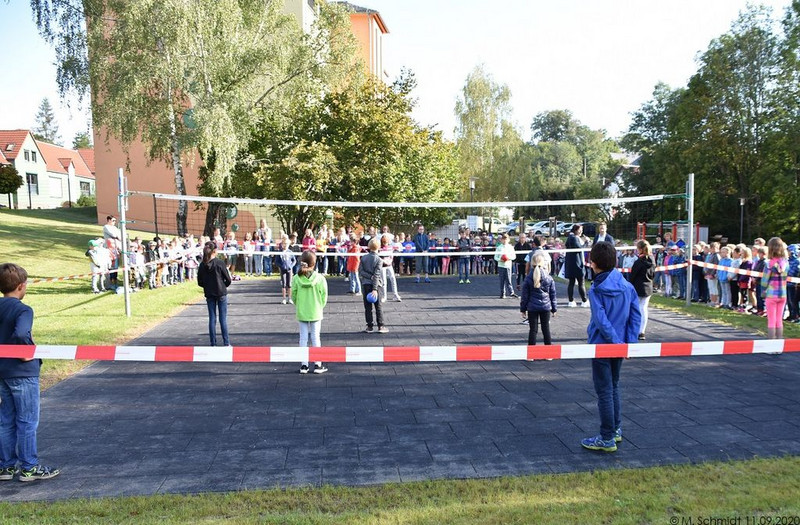 Mit strahlenden Gesichtern verfolgten die Kinder am Freitag, dem 11.09.2020, die Eröffnung des neuen Spielfeldes für „Ball über die Schnur“ und „Volleyball“ durch unseren Bürgermeister Herrn Tino Obst. Die Klasse 4b durfte das Spielfeld zuerst nutzen, um den anderen Kindern den Spielgedanken und das regelgerechte Verhalten zu zeigen.