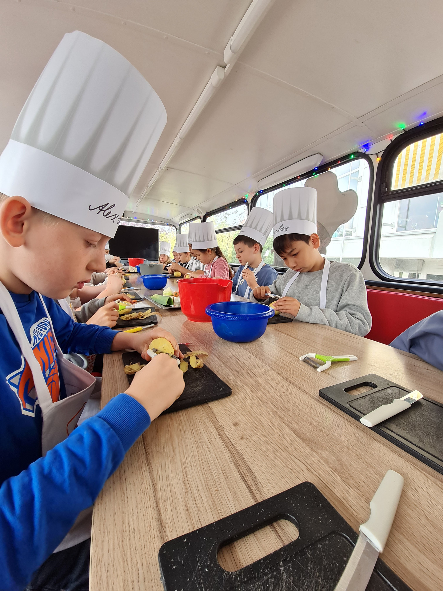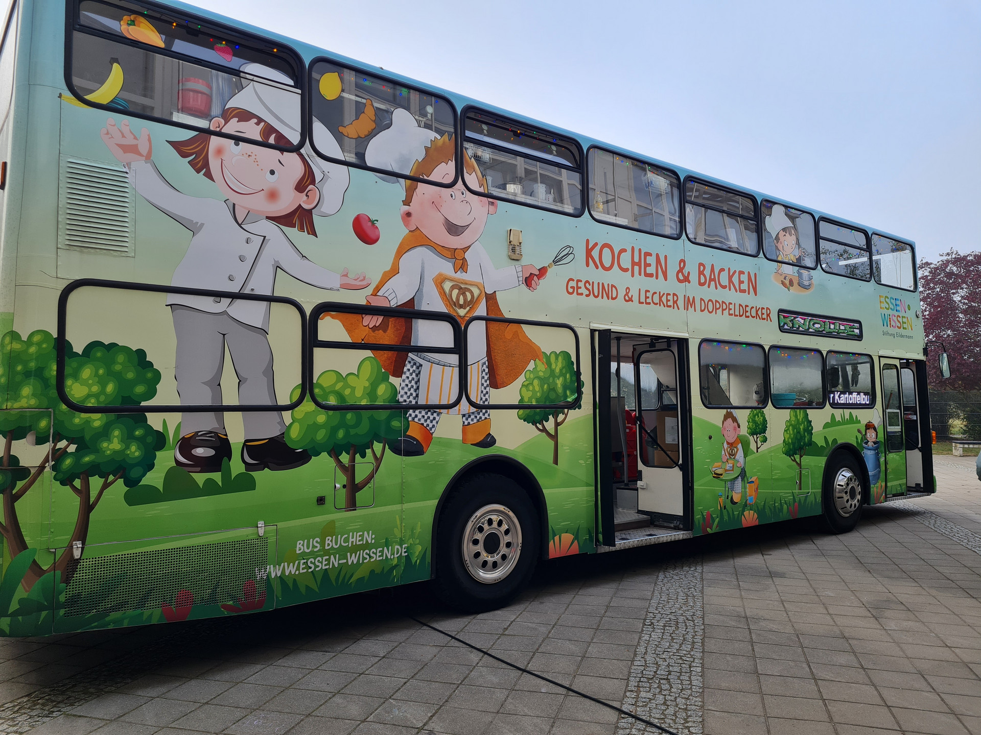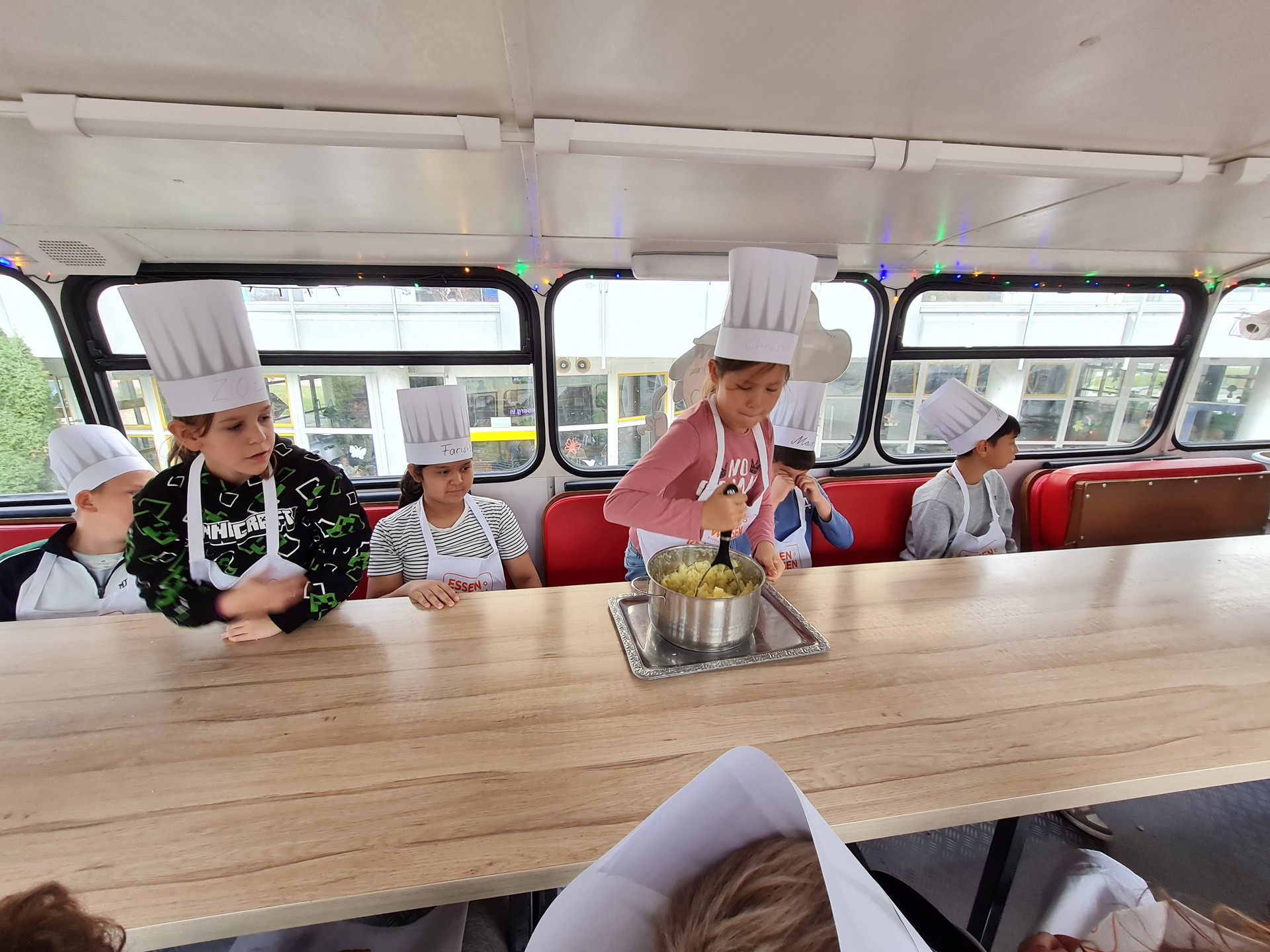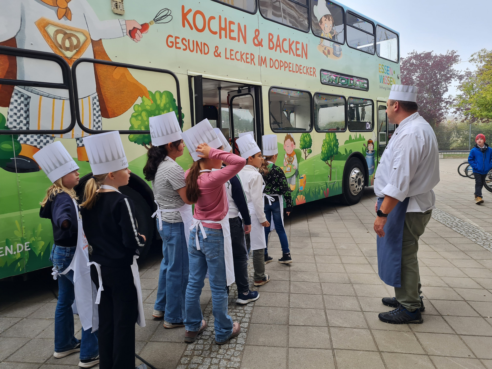 Am 2. Oktober staunten alle Kinder, als ein Doppelstockbus auf unserem Schulhof stand. In 5 Gruppen lernten die Viertklässler und ausgewählte Kinder der Klasse 3 Kartoffelgerichte zu kochen und natürlich hinterher zu verspeisen. Vom Kartoffelstampf über Kartoffelsuppe bis zu Pommes gab es immer neue Rezepte. Alle Kinder erhielten dann auch noch Geschenke: einen Sack Kartoffeln, eine Wintermütze, eine Brotbüchse und eine Kochschürze. Ein Rezepteheft gab es obendrein. Das war wirklich ein besonderer Tag.