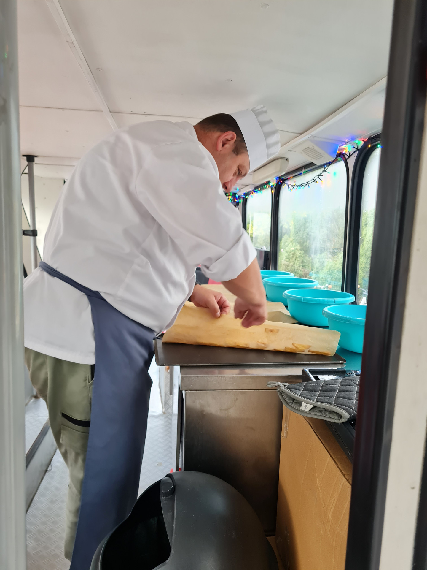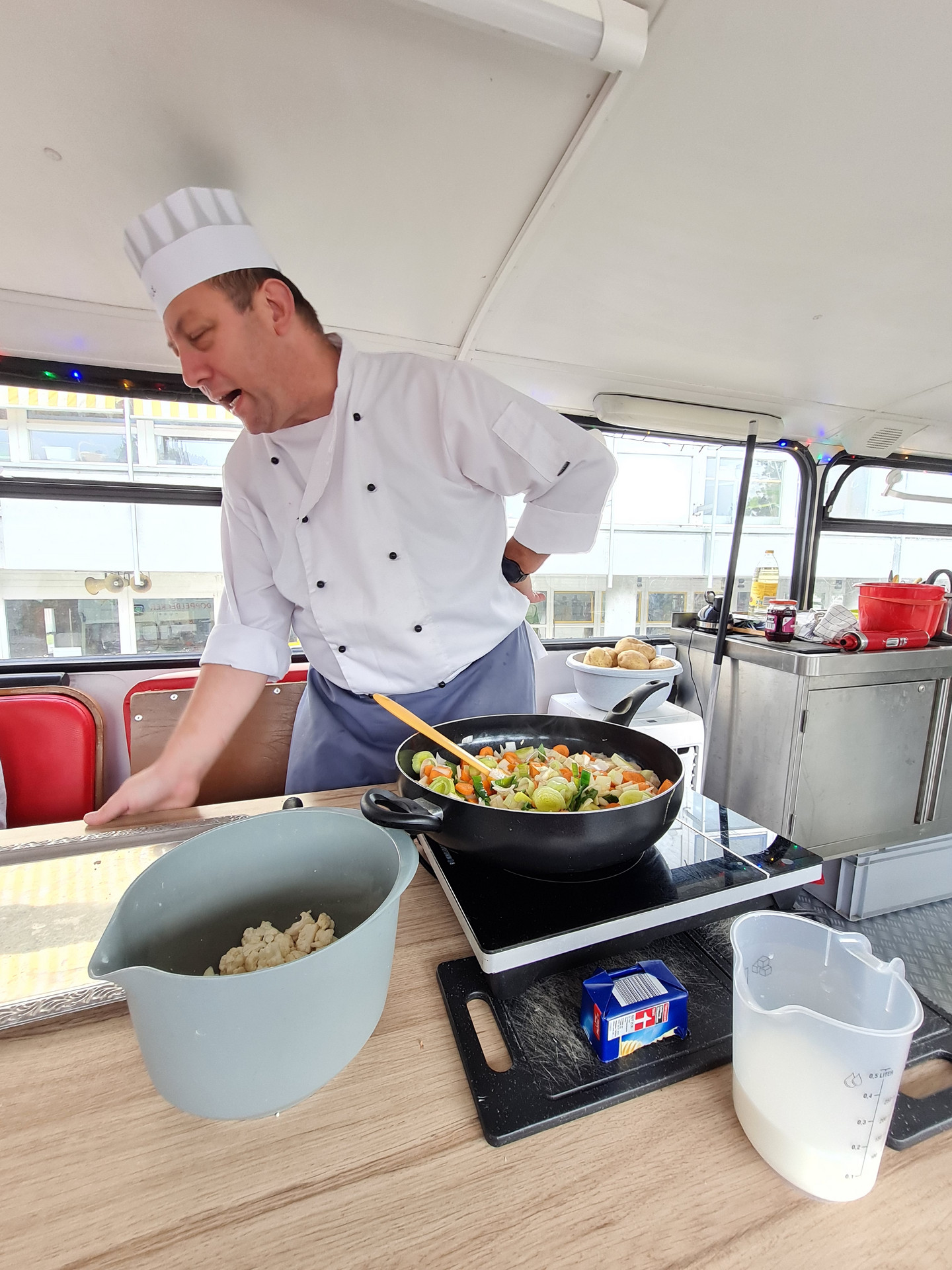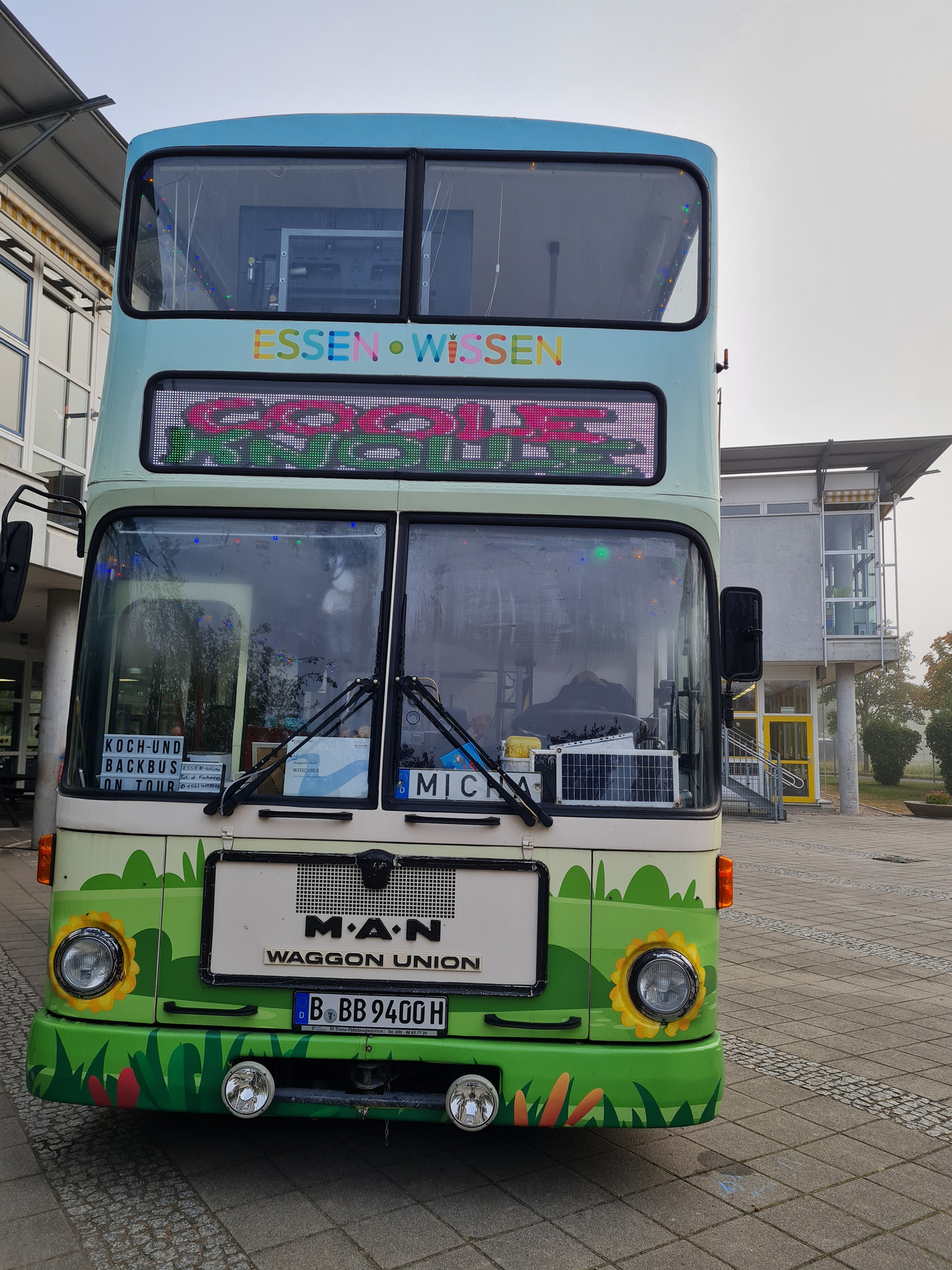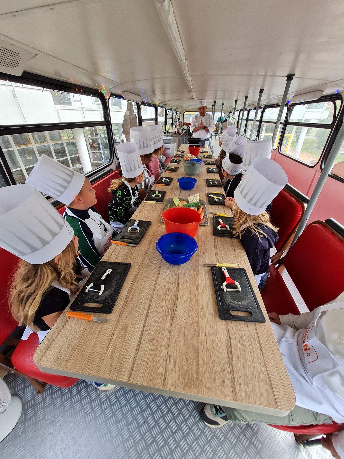 Am 2. Oktober staunten alle Kinder, als ein Doppelstockbus auf unserem Schulhof stand. In 5 Gruppen lernten die Viertklässler und ausgewählte Kinder der Klasse 3 Kartoffelgerichte zu kochen und natürlich hinterher zu verspeisen. Vom Kartoffelstampf über Kartoffelsuppe bis zu Pommes gab es immer neue Rezepte. Alle Kinder erhielten dann auch noch Geschenke: einen Sack Kartoffeln, eine Wintermütze, eine Brotbüchse und eine Kochschürze. Ein Rezepteheft gab es obendrein. Das war wirklich ein besonderer Tag.