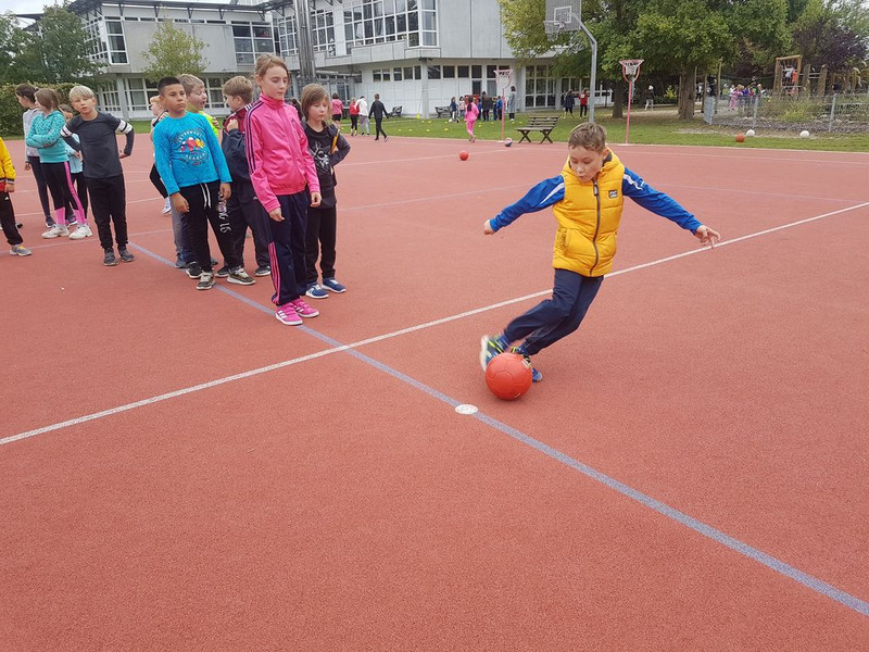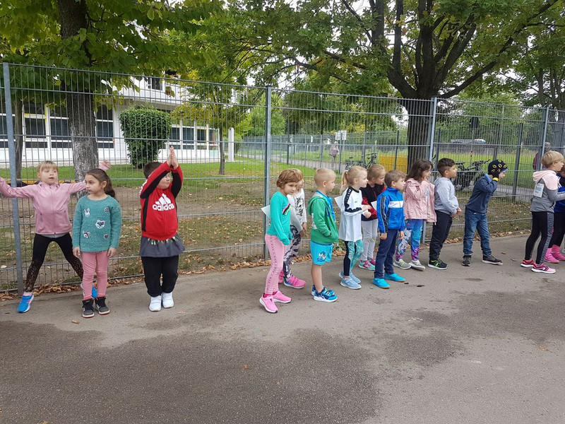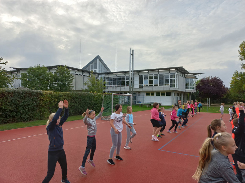 Nach einer tollen Begrüßung durch Herrn Wirth mit einer Laolawelle der gesamten Schule startete unser diesjähriger Sporttag. Dann erfolgte die Erwärmung.